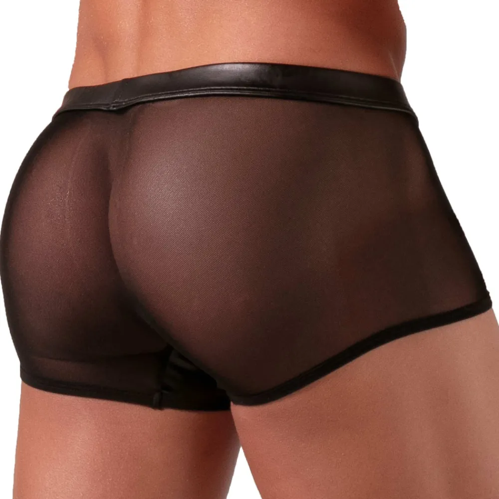 Boxer sexy en résille extensible et transparente. Poche frontale en simili-cuir avec fermeture Eclair fonctionnelle. Ceinture élastique recouverte. Petite poche secrète. Fabrication française.