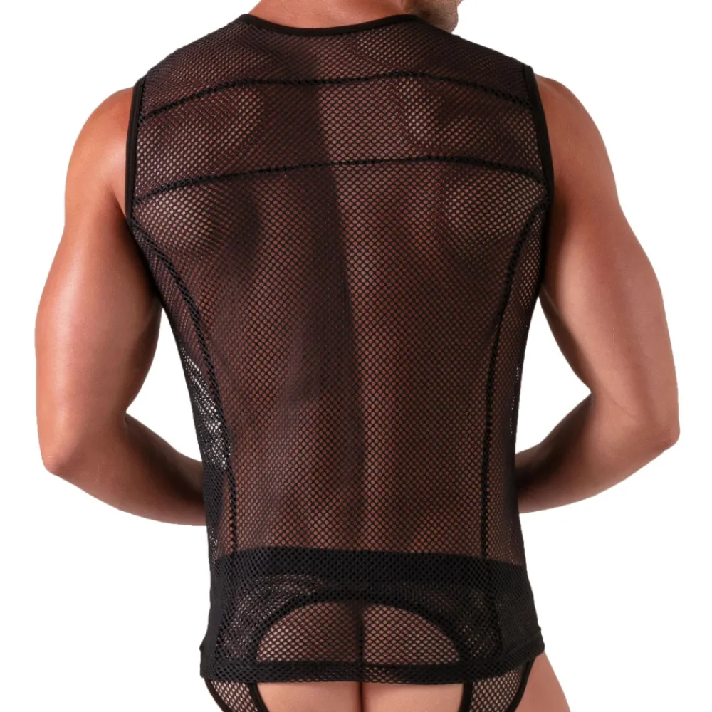 Débardeur sexy en résille, dont le maillage large ne laisse que peu de place à l’imagination. Coupe ajustée. Fabrication française.