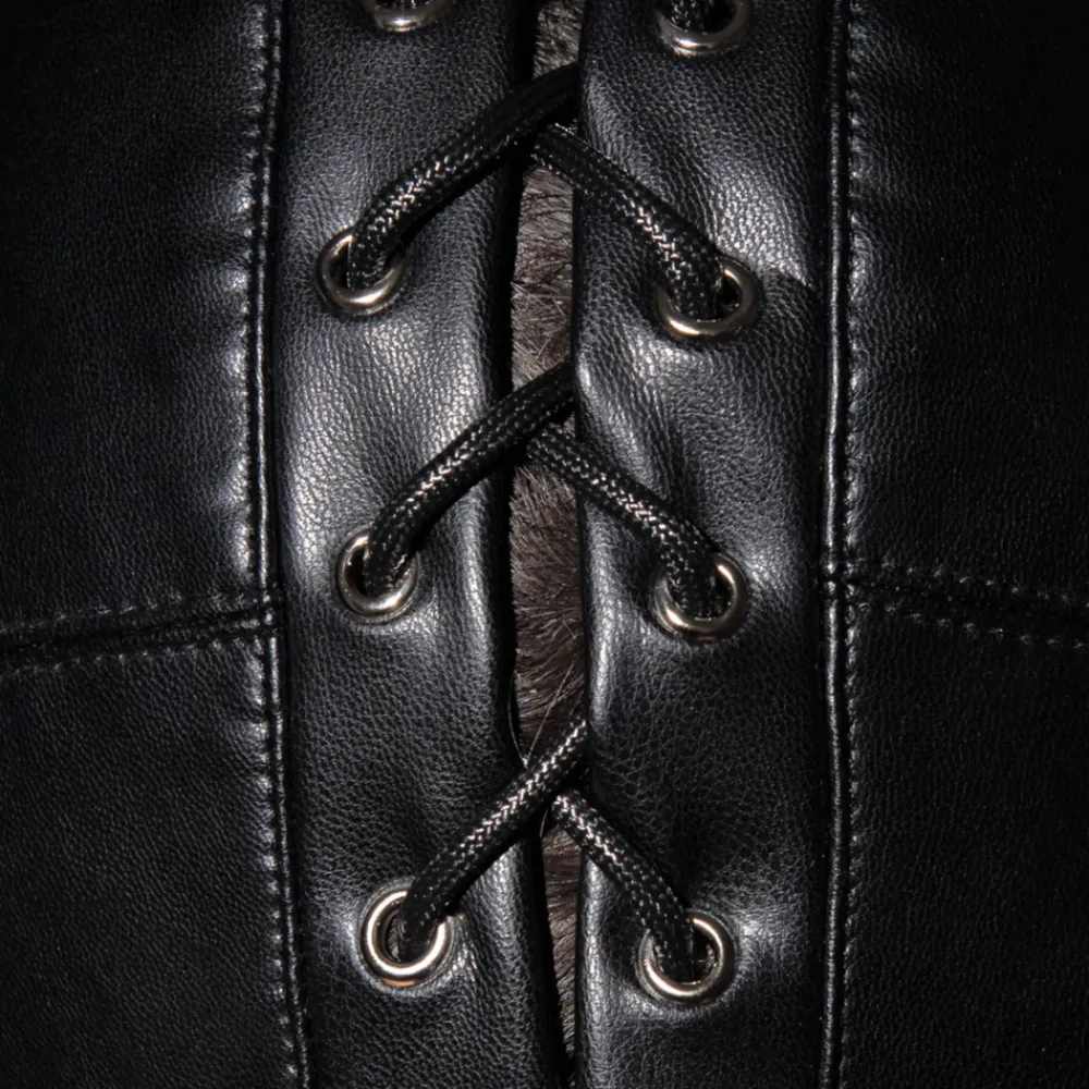 Cagoule en microfibre stretch imitant parfaitement le cuir, pour un look très fetish. Orifices pour les yeux et la bouche, oeillets métalliques pour le nez. Idéal pour les jeux de domination et de soumission. Laçage façon corset et boucle métallique à l’arrière pour un ajustement parfait. Logo AD Fetish en silicone.