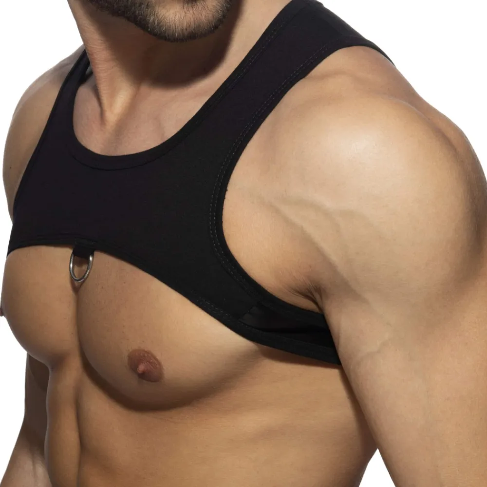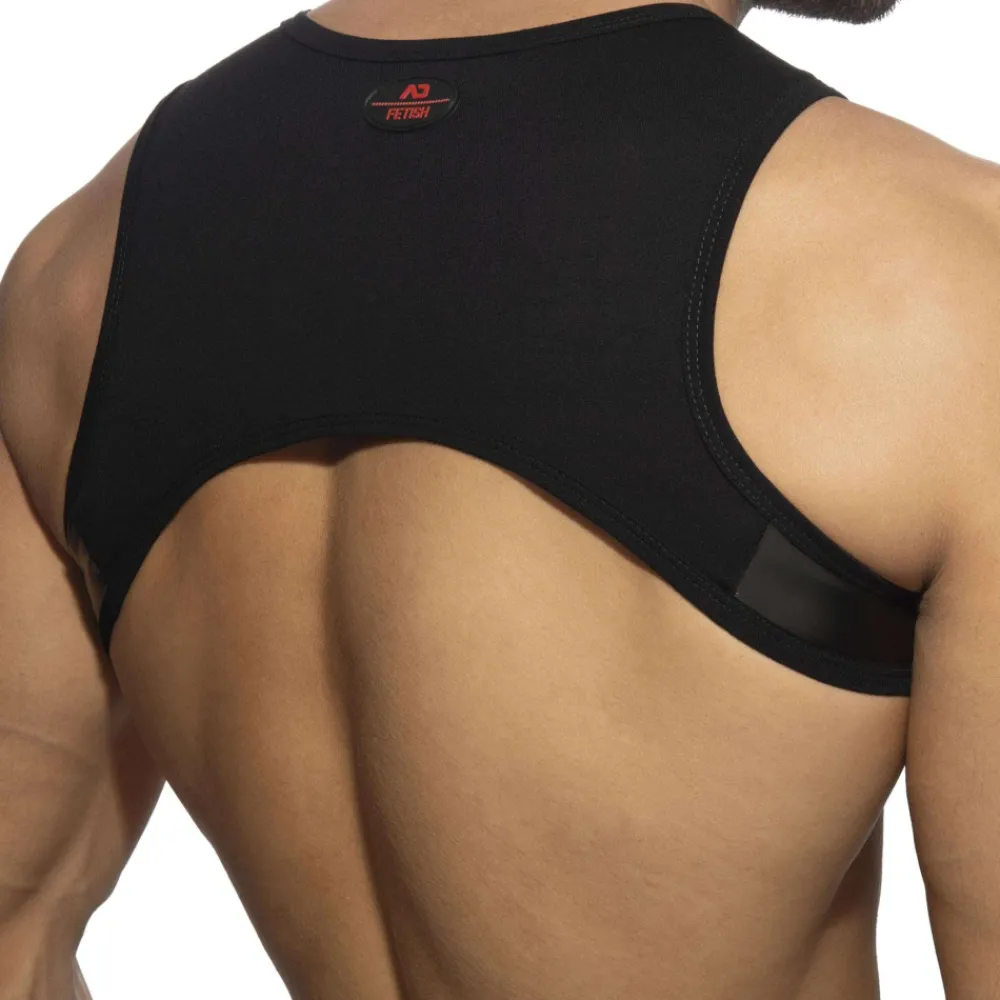 Harnais sexy en mélange de viscose et de microfibre de couleur unie. Empiècements en simili cuir sur les côtés. Boucle metallique devant. Etiquette AD Fetish en silicone à l’arrière.