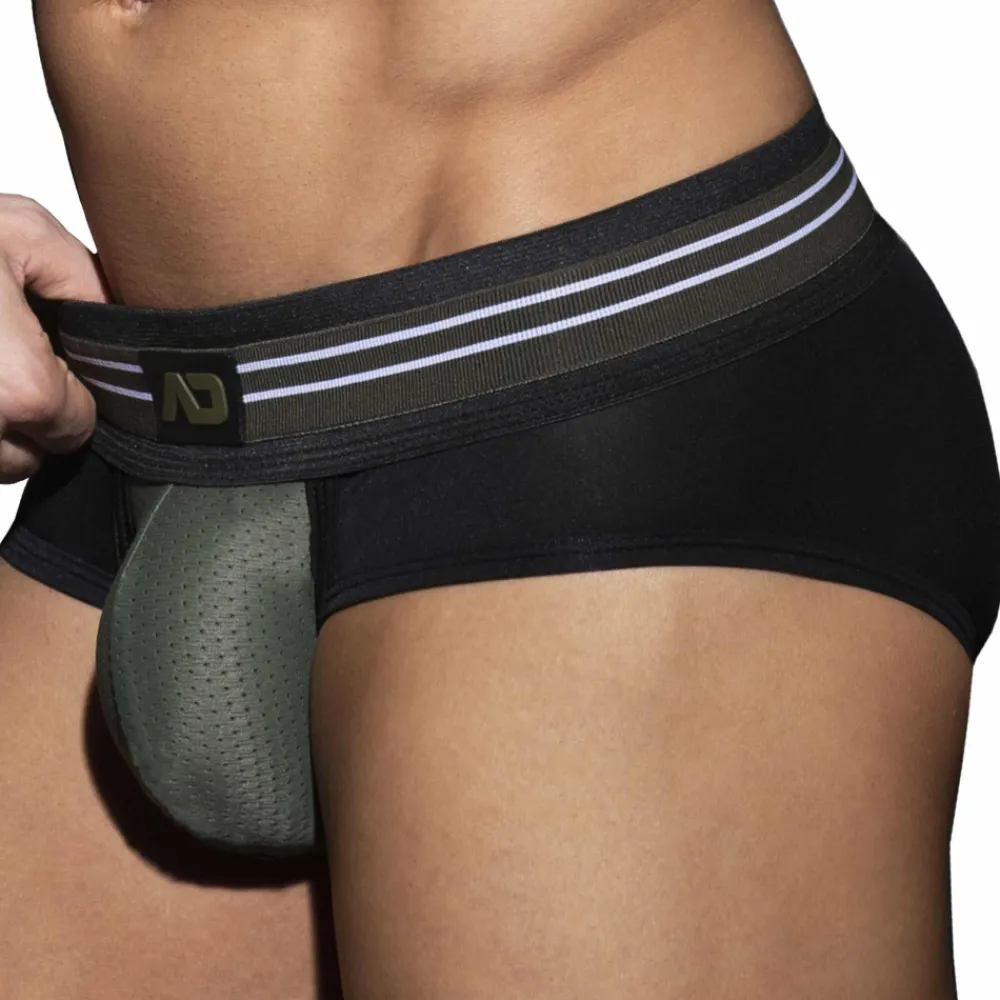Slip taille basse en microfibre fine et légère. Poche frontale en mesh respirant de couleur contrastée. Ceinture élastique extra-large décorée d’une double d’une bande rayée et du logo AD Fetish en silicone.