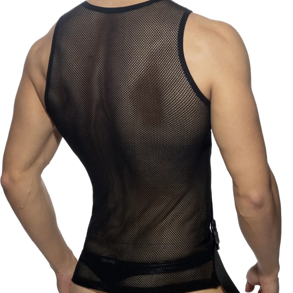 Débardeur très sexy en résille transparente. Design original et innovant avec sa doublure sur le torse qui intègre 2 sangles ajustables avec clips fonctionnels. Logo AD Fetish en silicone cousu sur la poitrine.