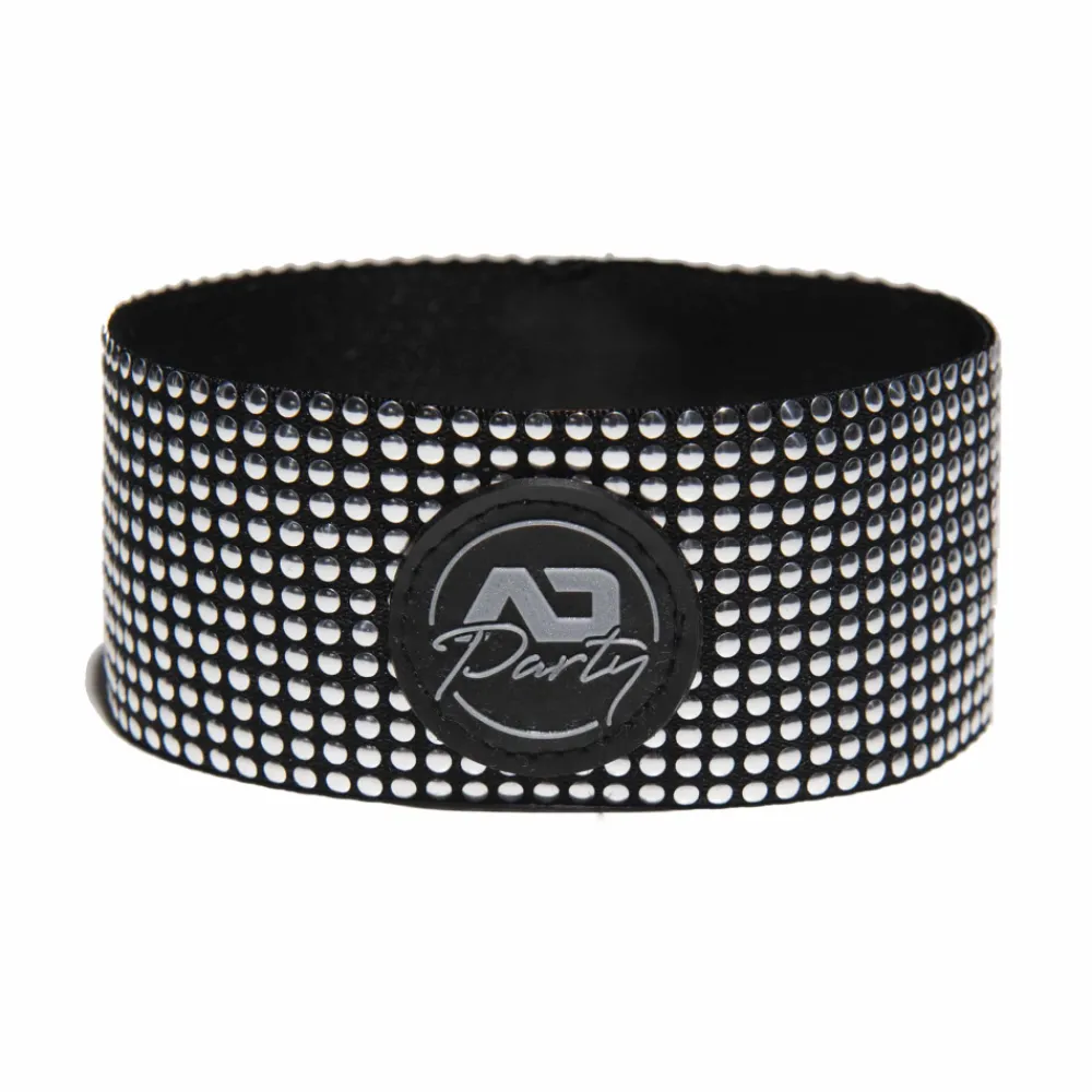 Brassard sexy et original constitué d’une large bande élastique recouverte de picots argentés apportants des reflets métalliques scintillants. Logo AD Party en silicone. Vendu à l’unité.