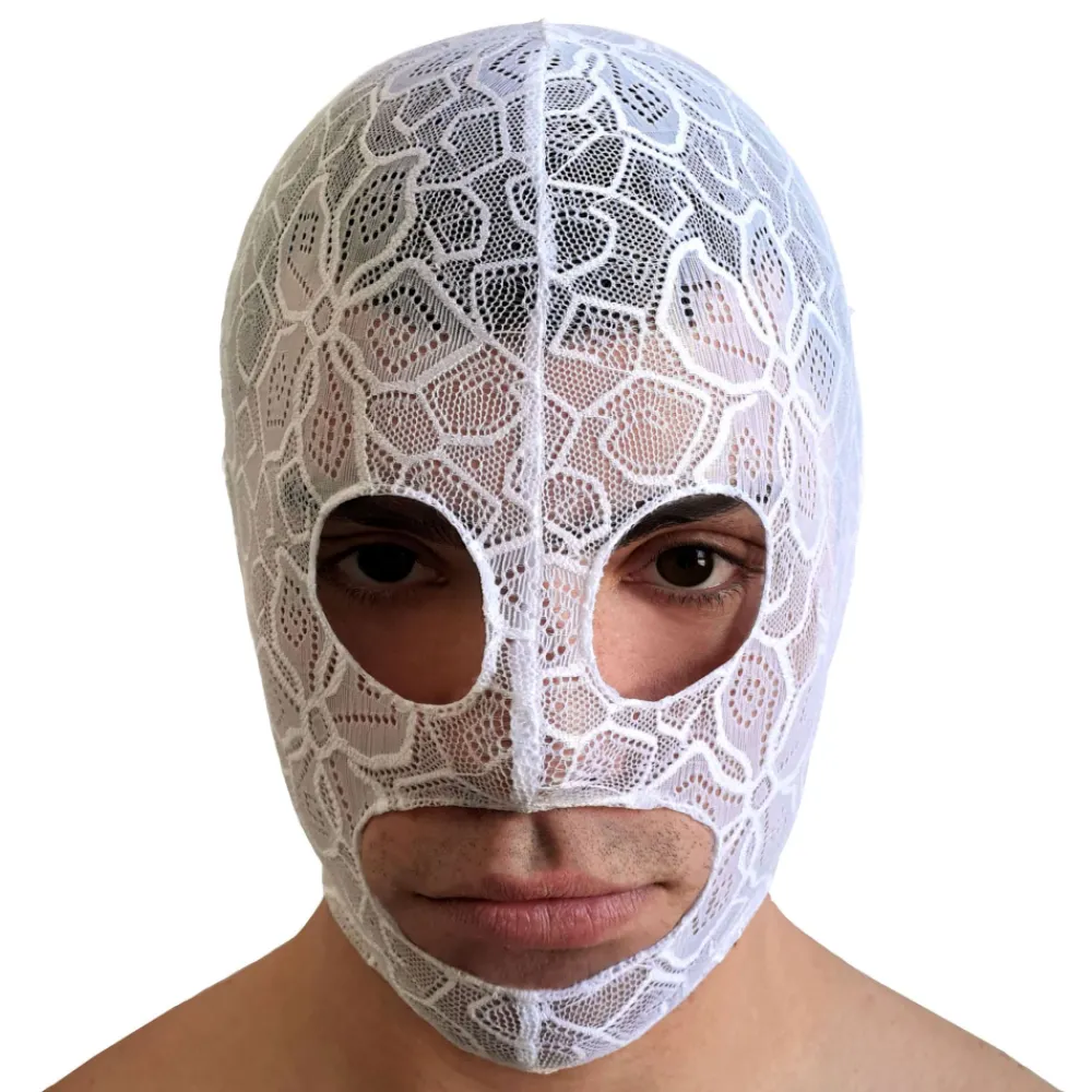 Cagoule en dentelle ornée d’un motif floral. Idéale pour s’adonner aux jeux les plus coquins en toute discrétion. 3 orifices pour les yeux et la bouche. Logo AD en silicone et fermeture Eclair à l’arrière.