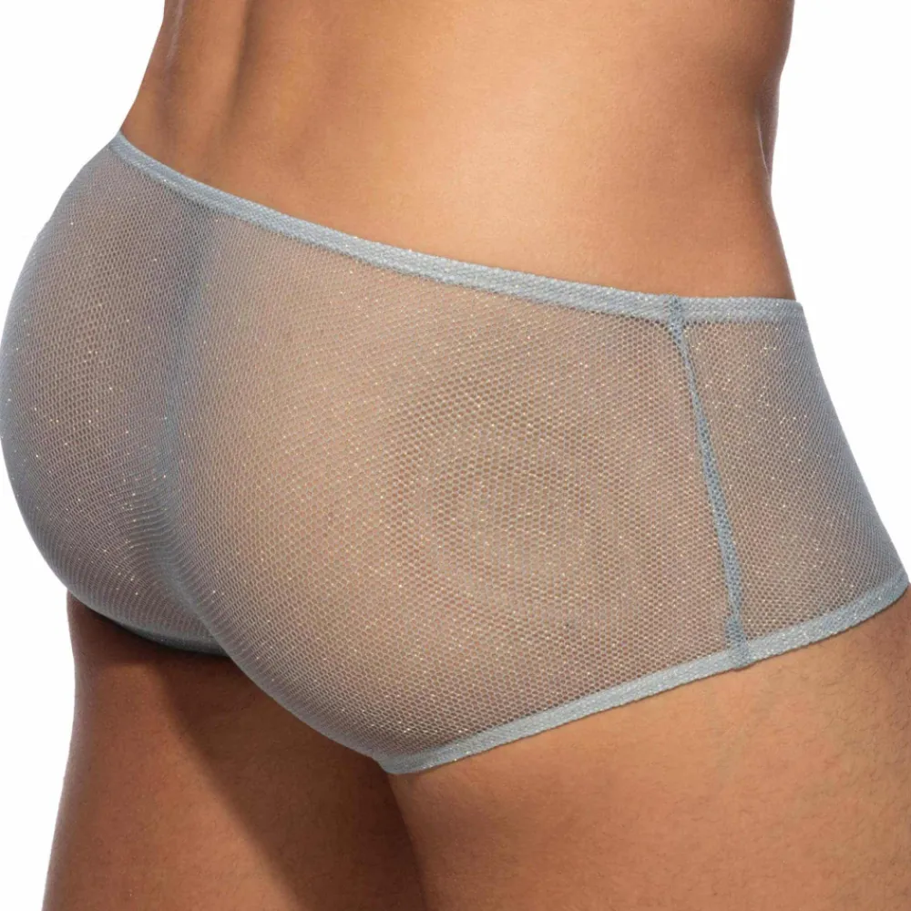 Mini boxer sophistiqué et sexy en résille transparente ornée de fils métallisés dorés. Matière fine, légère et respirante. Coupe taille basse, minimaliste et très ajustée. Poche frontale moulée sans couture pour un confort optimal. Logo Addicted en silicone sur la fine ceinture élastique.
