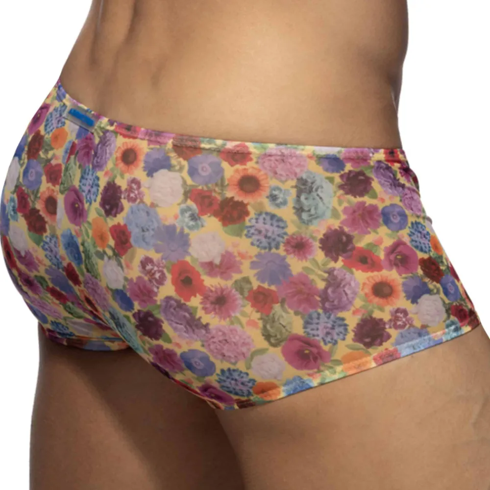 Shorty luxueux en résille imprimée d’un motif floral très coloré. Tissu fin, super extensible et totalement transparent. Coupe taille basse, minimaliste et très ajustée. Belle poche frontale non doublée. Etiquette Addicted en silicone à l’arrière.