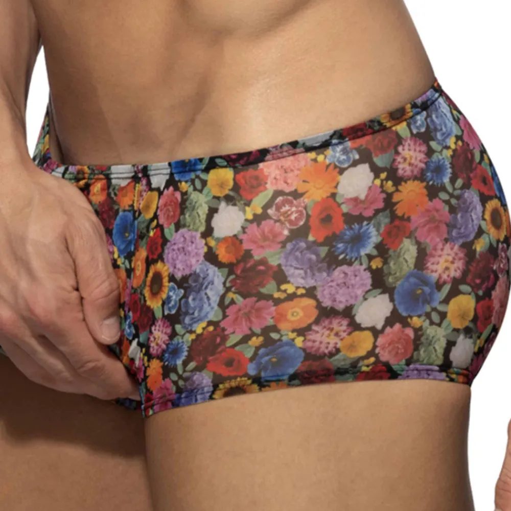 Shorty luxueux en résille imprimée d’un motif floral très coloré. Tissu fin, super extensible et totalement transparent. Coupe taille basse, minimaliste et très ajustée. Belle poche frontale non doublée. Etiquette Addicted en silicone à l’arrière.