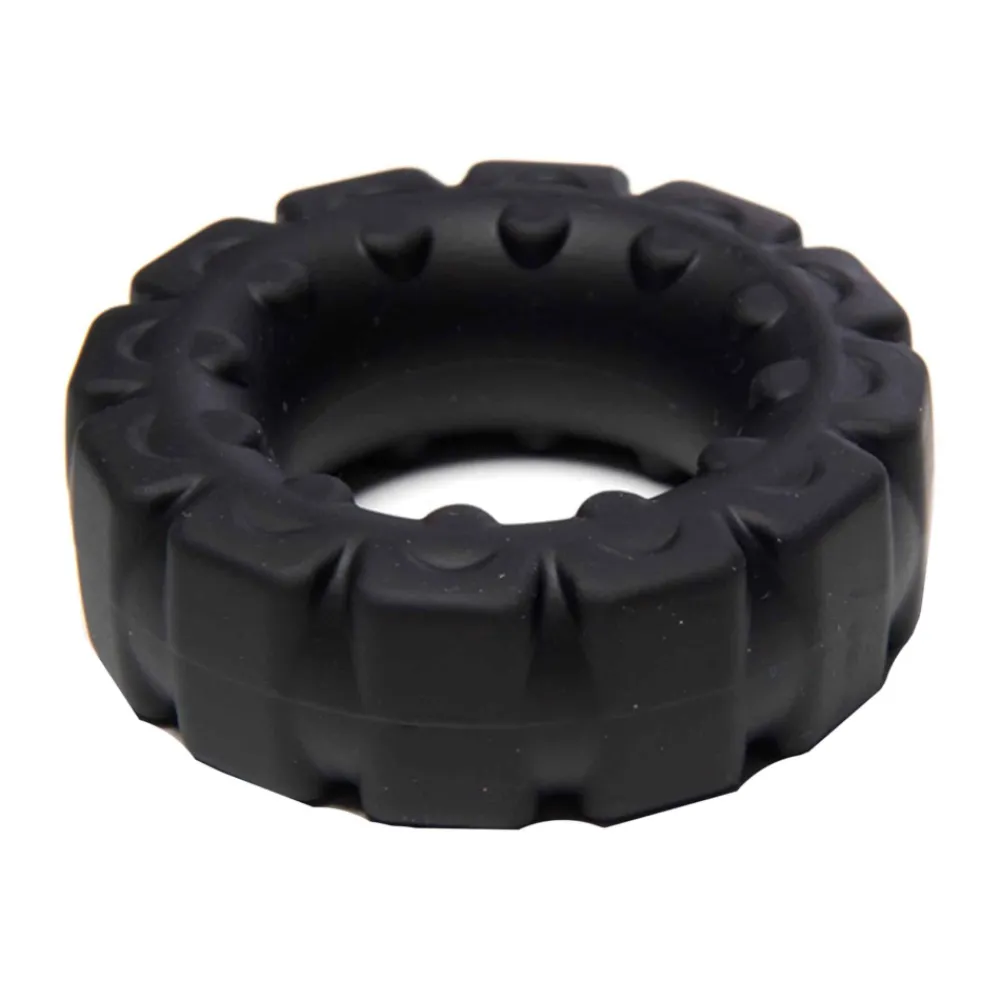Anneau pénien pour une érection plus dure et plus longue. Design original en forme de pneu de camion. Fabriqué en caoutchouc de silicone liquide super doux et extensible. Diamètre interne 2,5 cm, externe 5 cm.