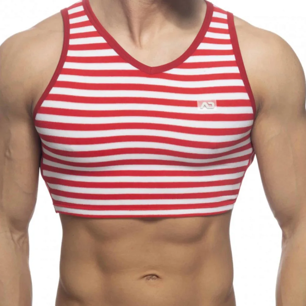 Débardeur sexy dont la coupe a été raccourcie pour dévoiler vos abdos. Partie avant en microfibre aussi douce que du velours, imprimée de rayures façon marinière. Bandes élastiques sur les côtés. Dos uni en coton. Etiquette AD en silicone sur la poitrine.