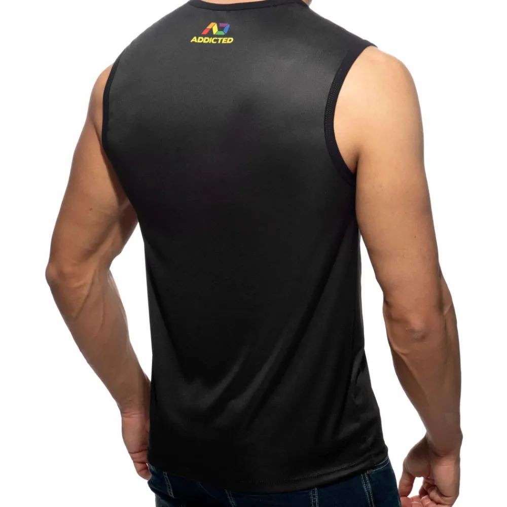 Débardeur ajusté en microfibre extensible douce, légère et confortable. Imprimé KISS ME aux couleurs de l’arc-en-ciel sur la poitrine. Petit logo Addicted en haut du dos.