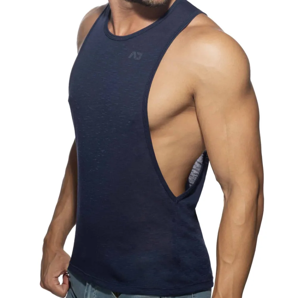 Débardeur en microfibre flammée très fine, légère, et semi-transparente. Large ouvertures sous les bras. Imprimé Addicted ton sur ton sur la poitrine et dans le dos.