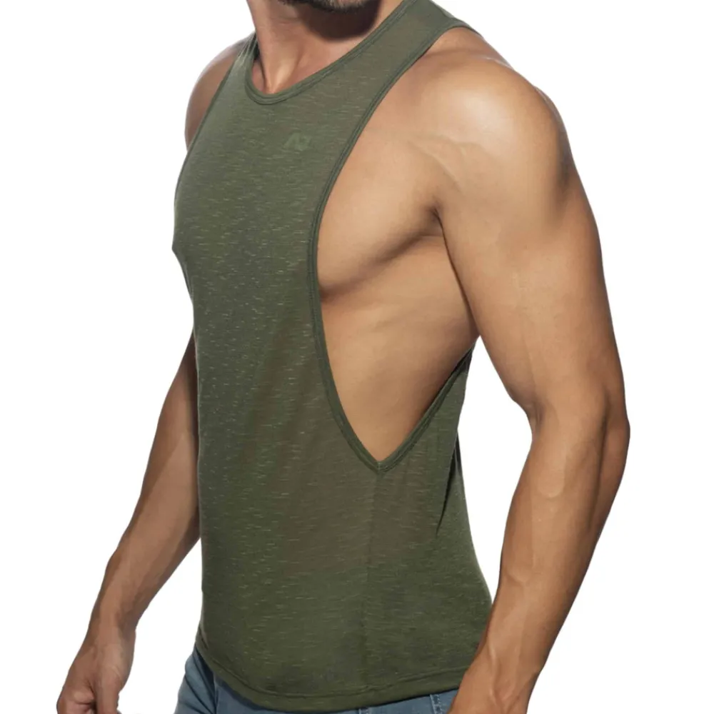 Débardeur en microfibre flammée très fine, légère, et semi-transparente. Large ouvertures sous les bras. Imprimé Addicted ton sur ton sur la poitrine et dans le dos.
