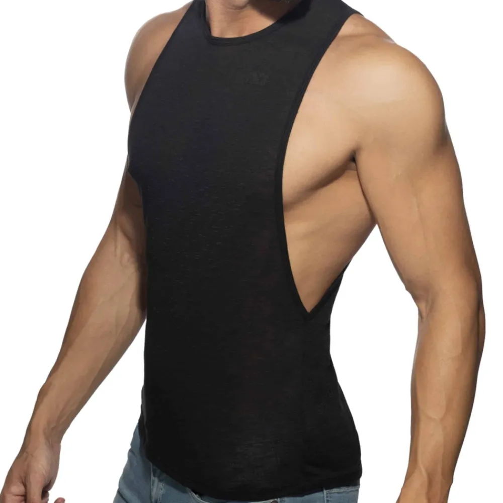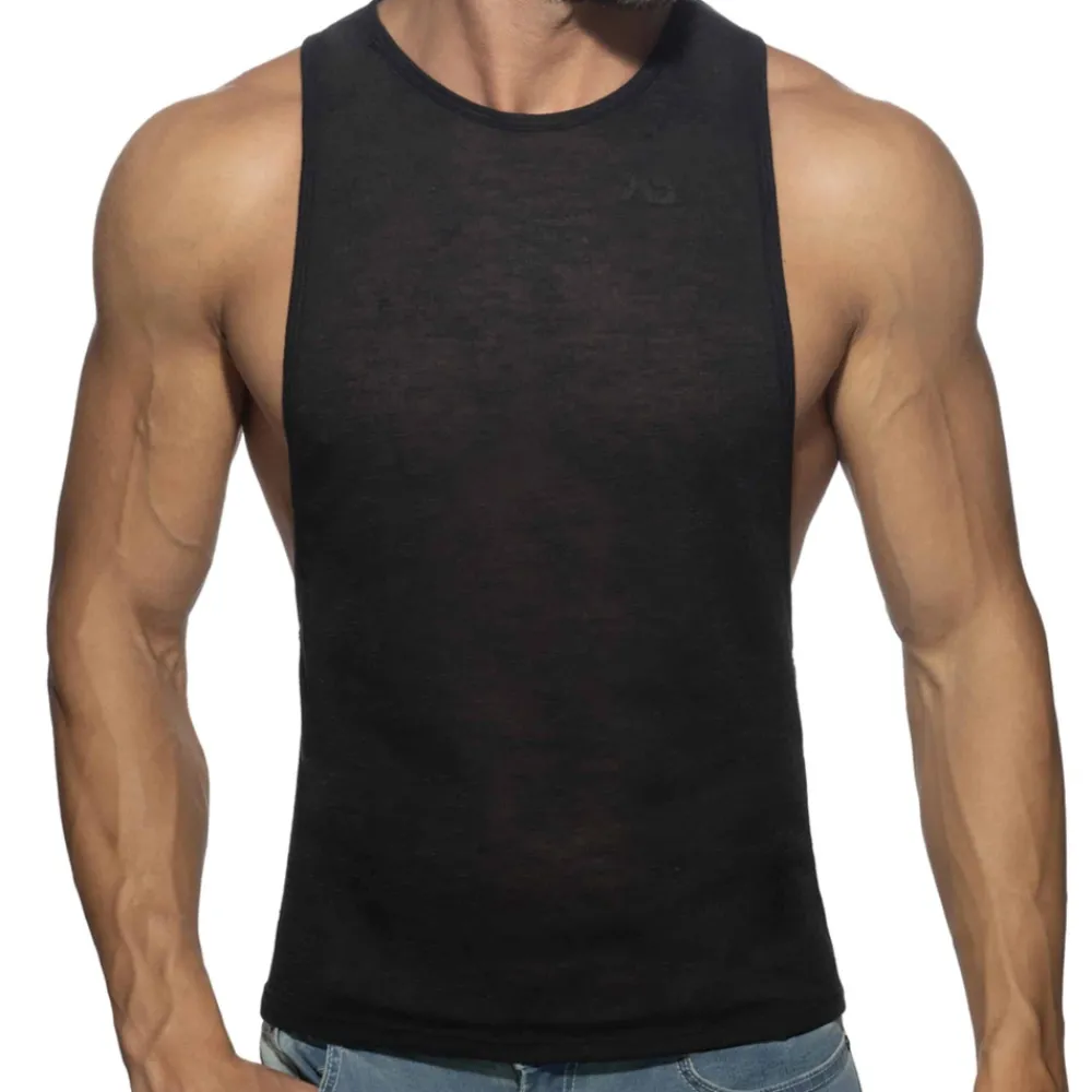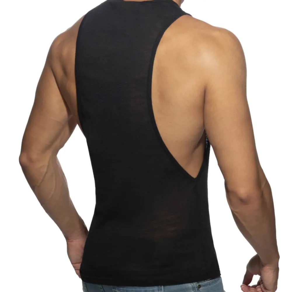 Débardeur en microfibre flammée très fine, légère, et semi-transparente. Large ouvertures sous les bras. Imprimé Addicted ton sur ton sur la poitrine et dans le dos.