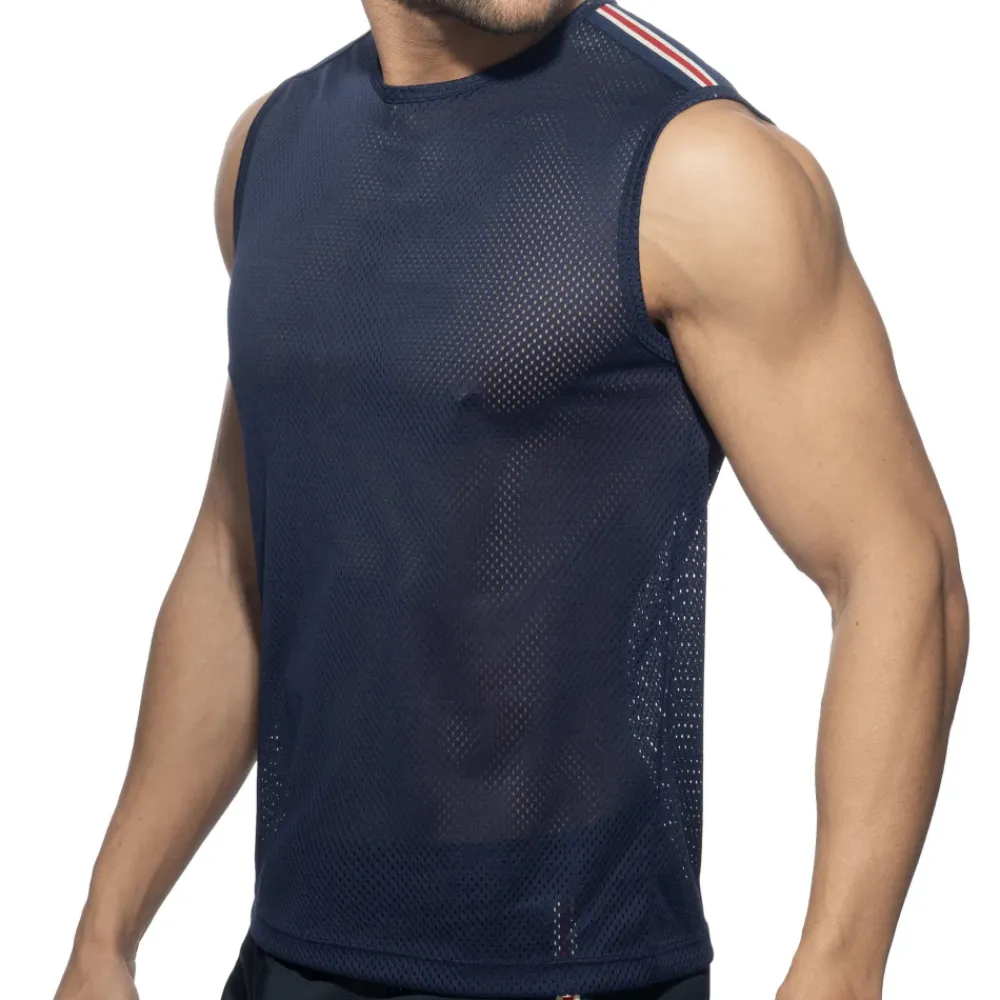 Débardeur sport en résille légère et respirante. Bandes tricolores sur les épaules. Etiquette AD en silicone dans le dos.