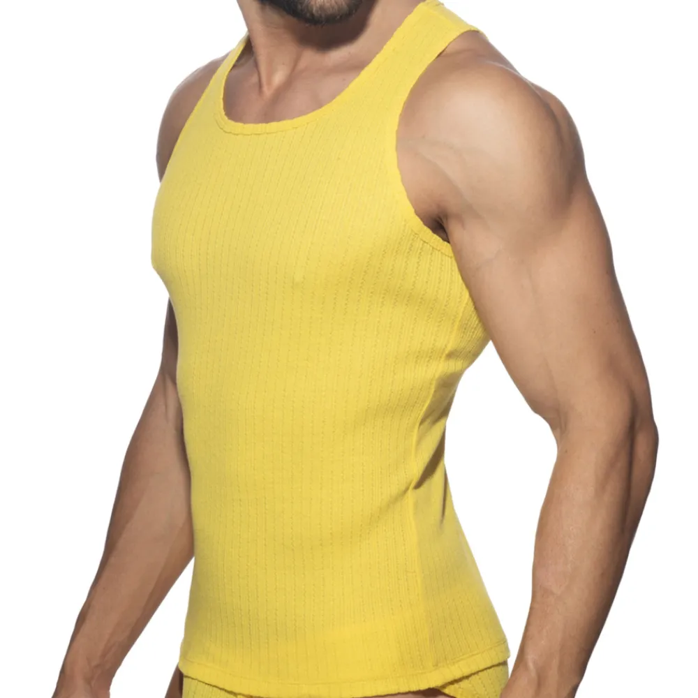 Débardeur confortable en mélange super doux et extensible de coton et de microfibre. Tissu chaud, côtelé et moelleux, conservant cependant une légère transparence. Coupe ajustée avec col rond. Logo AD en silicone dans le dos.