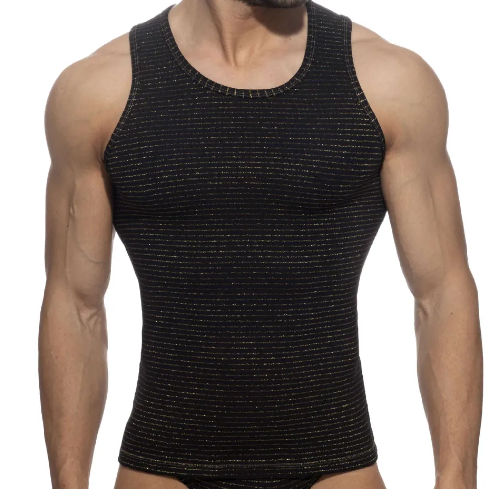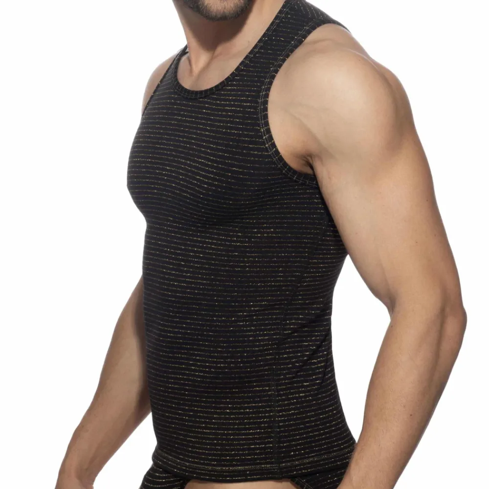 Débardeur réversible en microfibre alliant élégance et confort. Grâce à la technologie U-Turn, il présente deux motifs distincts : fines rayures dorées d’un côté et pois dorés de l’autre. Coupe ajustée et col rond. Etiquette AD en silicone en haut du dos.