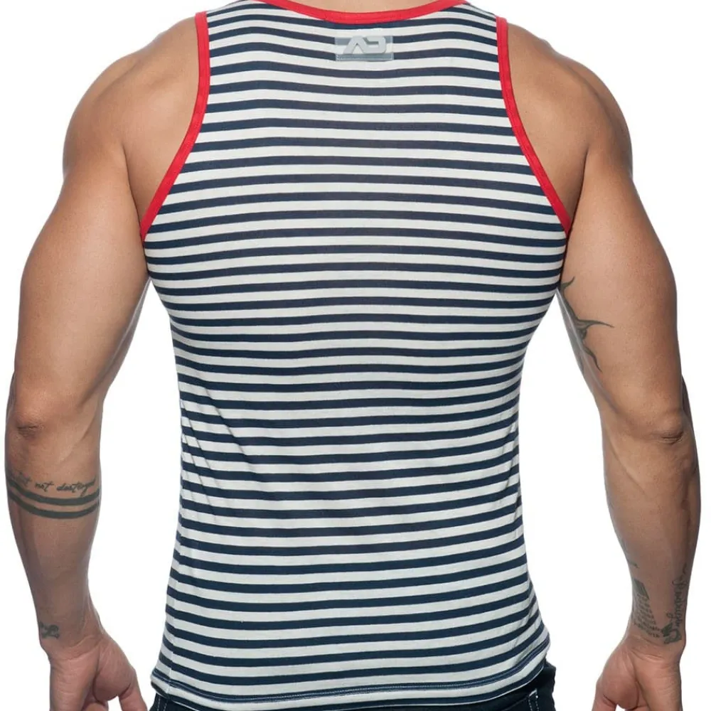 Débardeur très ajusté en mélange doux, frais et soyeux à base de viscose. Imprimé marinère très tendance. Bordures de couleur contrastée. Logo Addicted en silicone dans le dos. Fabriqué à Barcelone.