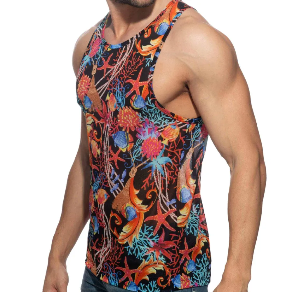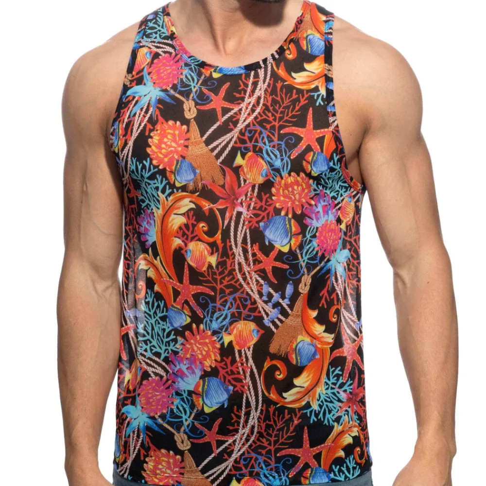 Débardeur chic et élégant en microfibre ultra légère et respirante. Imprimé récif coralien. Coupe ajustée. Col rond. Etiquette AD en silicone en haut du dos.
