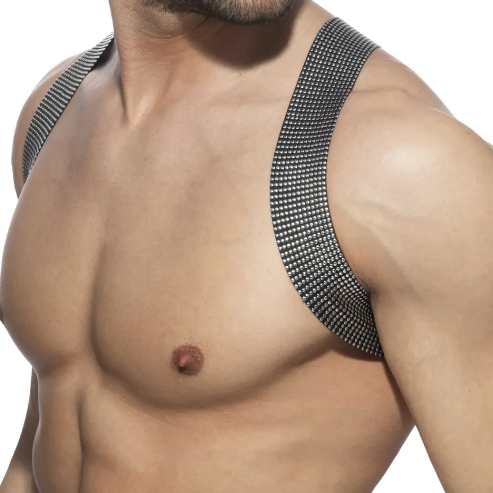 Harnais original et confortable, dont les larges bandes élastiques se croisent en formant un X dans le dos. Les straps sont recouverts de picots argentés apportants des reflets métalliques scintillants. Logo AD Party en silicone à l’arrière. Taille XS/S pour un tour de poitrine de 84 à 94 cm. M/L : 94 à 104 cm. XL/XXL : 104 à 114 cm.