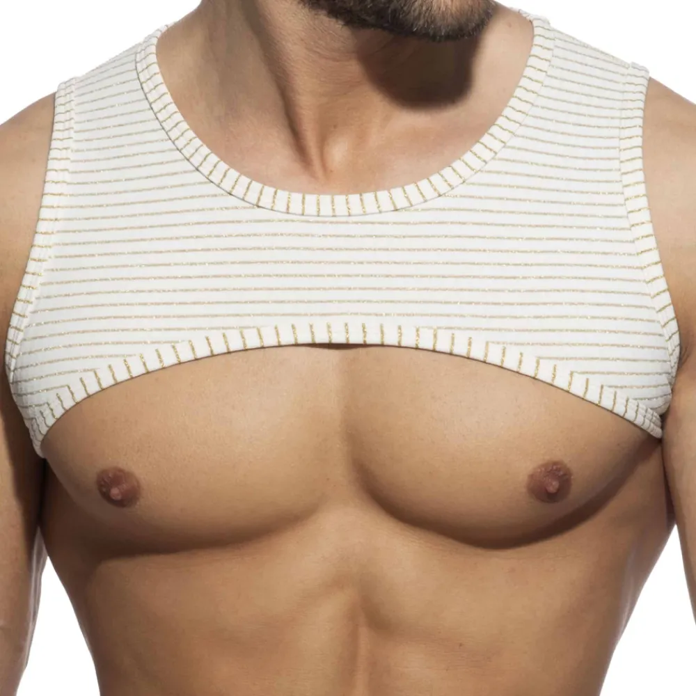 Harnais réversible en microfibre alliant élégance et confort. Grâce à la technologie U-Turn, il présente deux motifs distincts : fines rayures dorées d’un côté et pois dorés de l’autre. Logo AD en silicone à l’arrière.