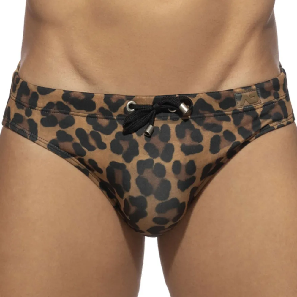 Slip de bain doux et confortable en microfibre stretch. Imprimé leopard. Système Pack Up intégré avec mousse amovible pour plus de volume frontal. Poche frontale moulée sans couture pour un confort optimal. Ceinture élastique avec cordon de serrage et logo AD en silicone.