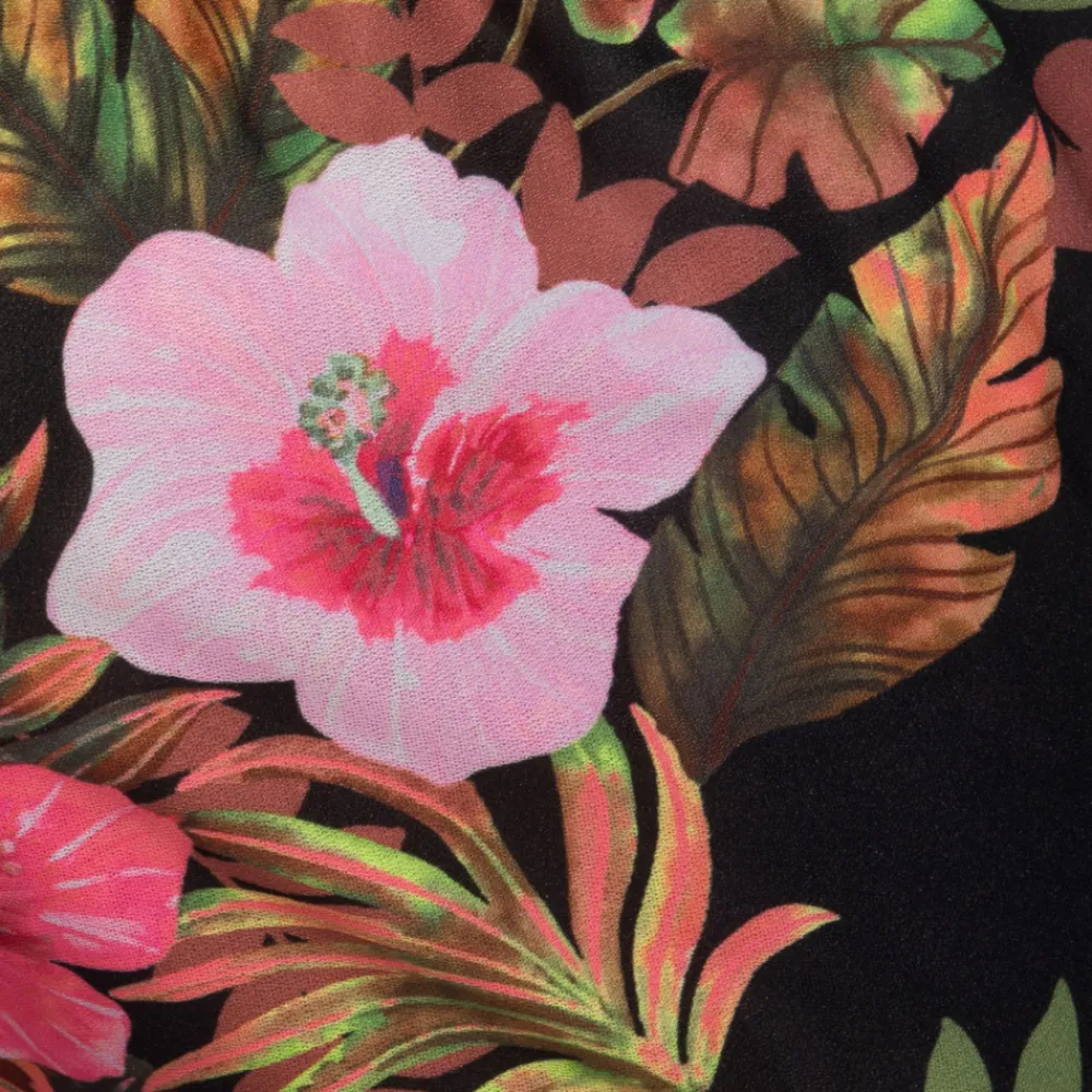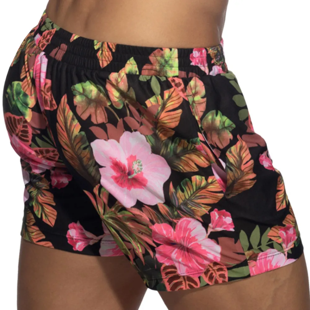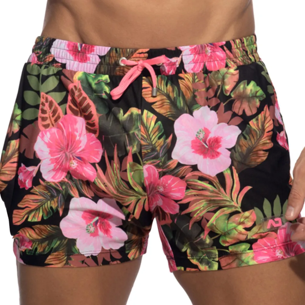 Short en microfibre semi-transparente, douce et légère. Superbe imprimé tropical constitué de fleurs roses sur fond noir. Poches latérales. Ceinture élastique avec cordon de serrage. Etiquette AD en silicone sur la cuisse gauche.