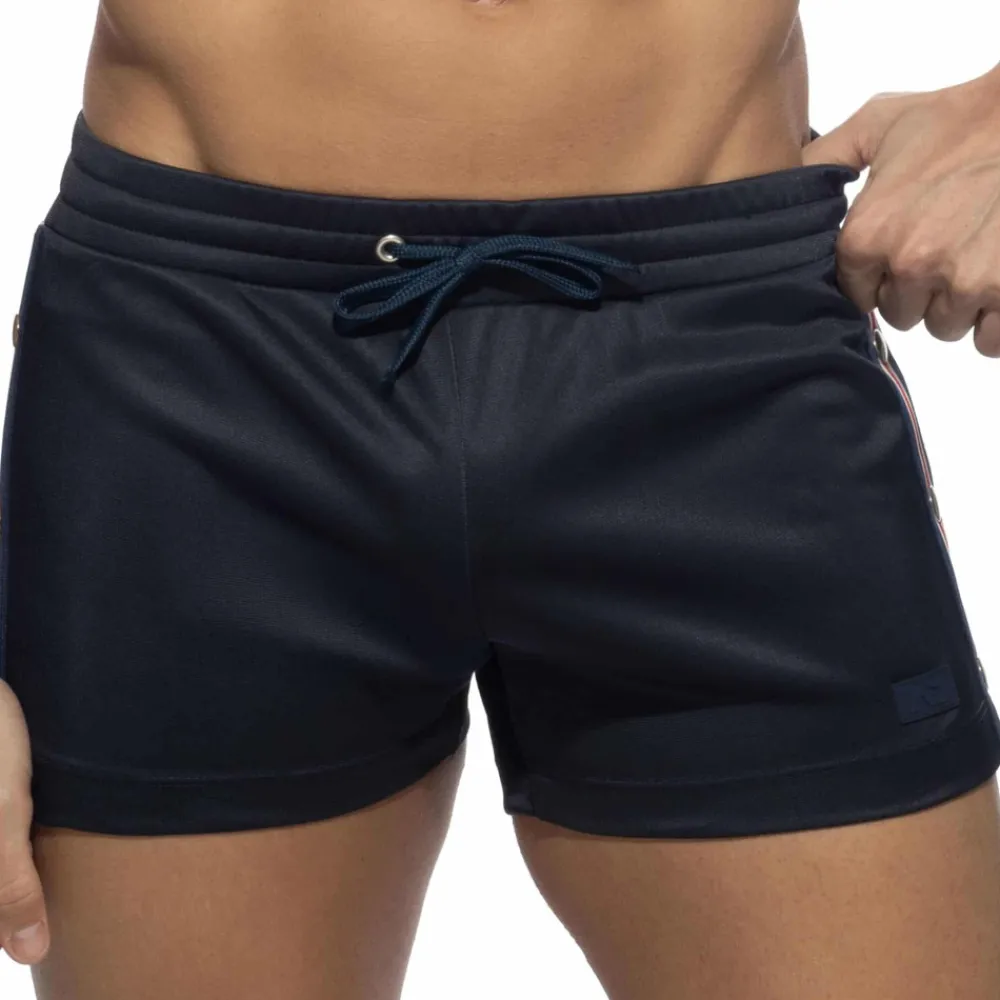 Short court, sport et sexy en microfibre légère et respirante. Coupe taille basse très ajustée. Bande tricolore de chaque côté avec 3 boutons-pression fonctionnels. Ceinture élastique avec cordon de serrage. Logo AD en silicone sur la cuisse gauche.