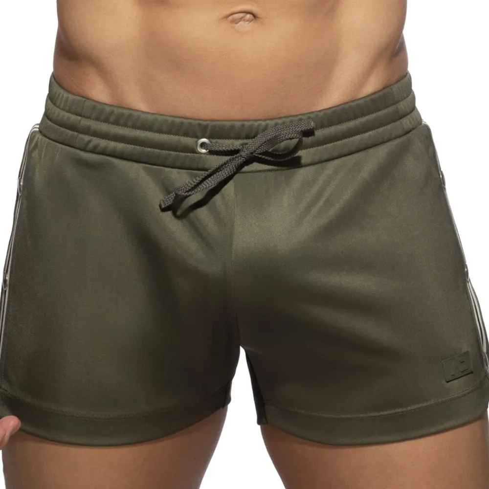 Short court, sport et sexy en microfibre légère et respirante. Coupe taille basse très ajustée. Bande tricolore de chaque côté avec 3 boutons-pression fonctionnels. Ceinture élastique avec cordon de serrage. Logo AD en silicone sur la cuisse gauche.