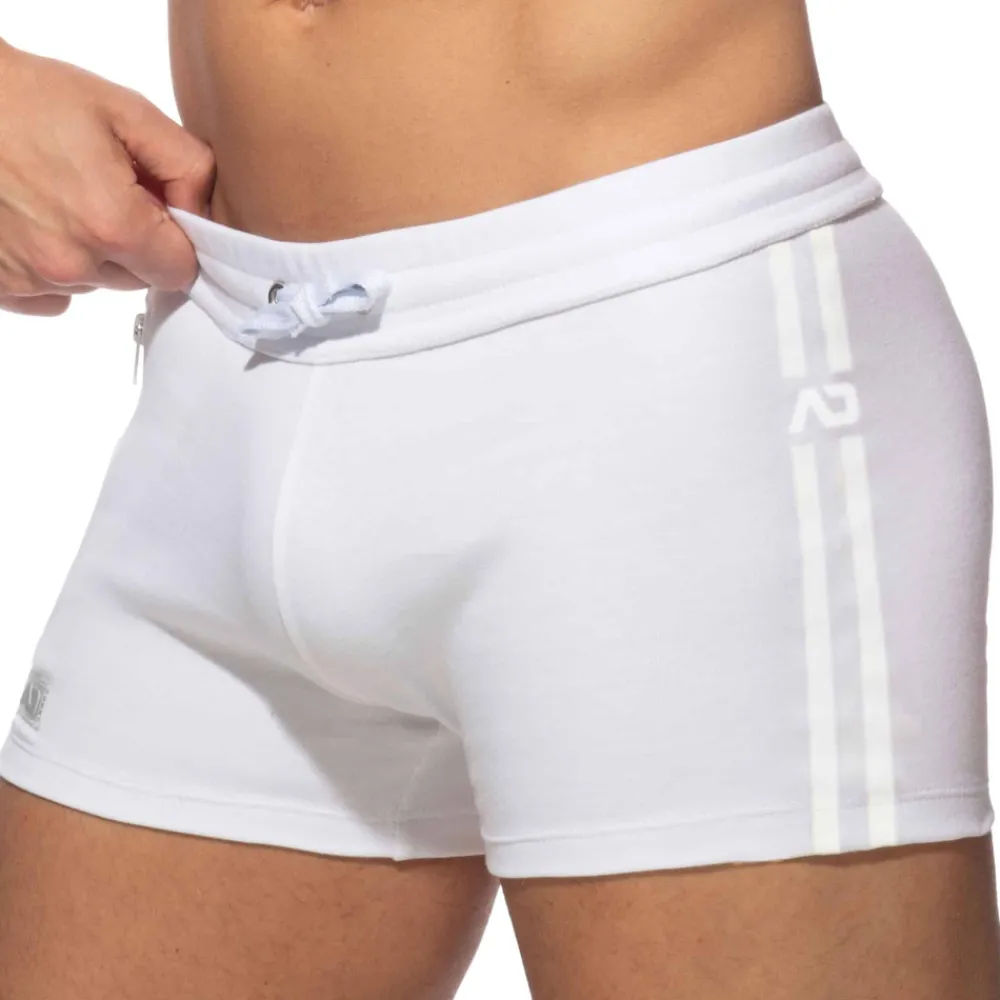 Short athlétique de couleur unie. Double bande sport de chaque côté. Ceinture élastique avec cordon de serrage. Poche à fermeture Eclair sur la cuisse droite. Logo AD en silicone.