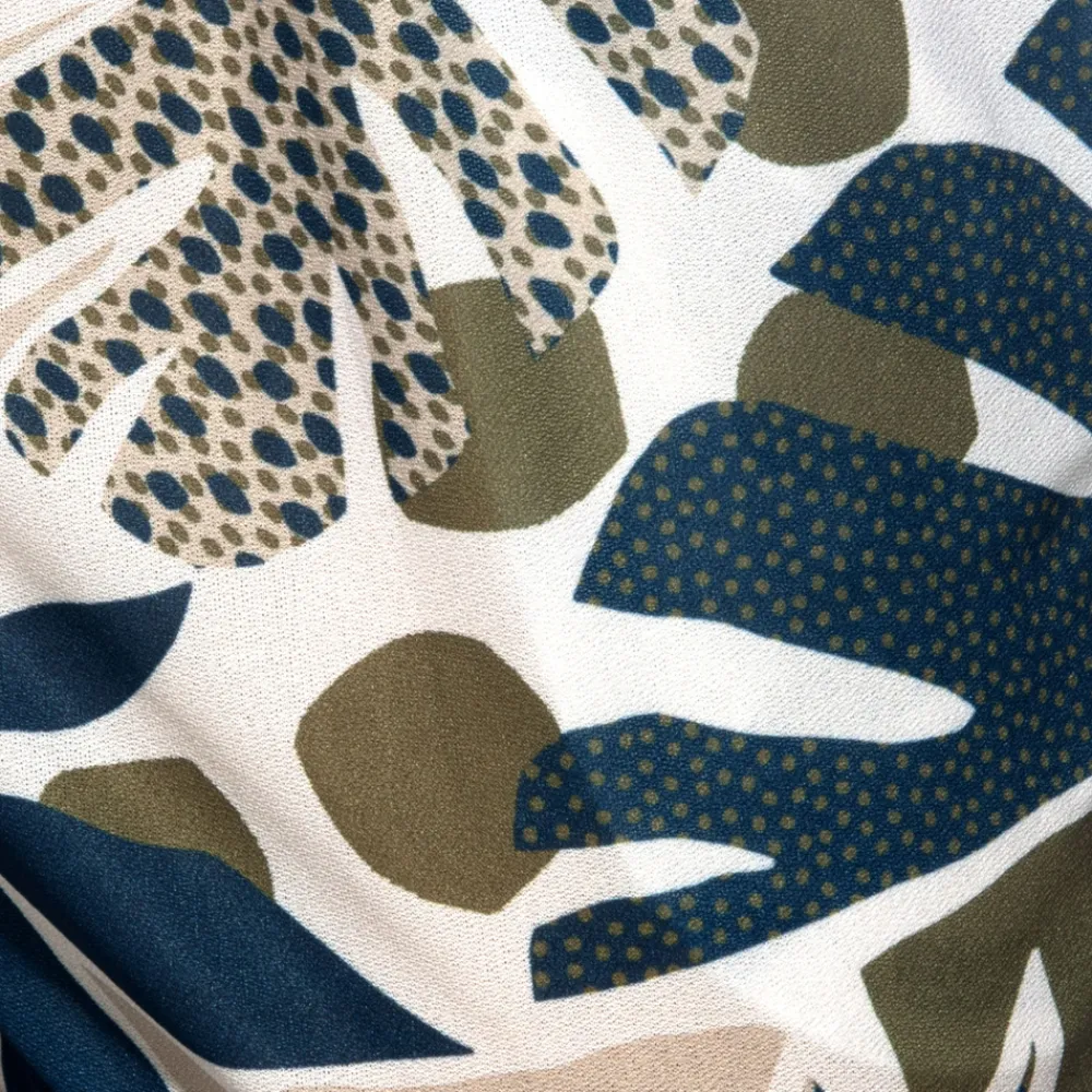 Short en microfibre respirante, douce et ultra légère. Imprimé tropical dans les tons kaki et bleu sur fond beige. Poches latérales. Ceinture élastique avec cordon de serrage. Etiquette AD en silicone sur la cuisse gauche.
