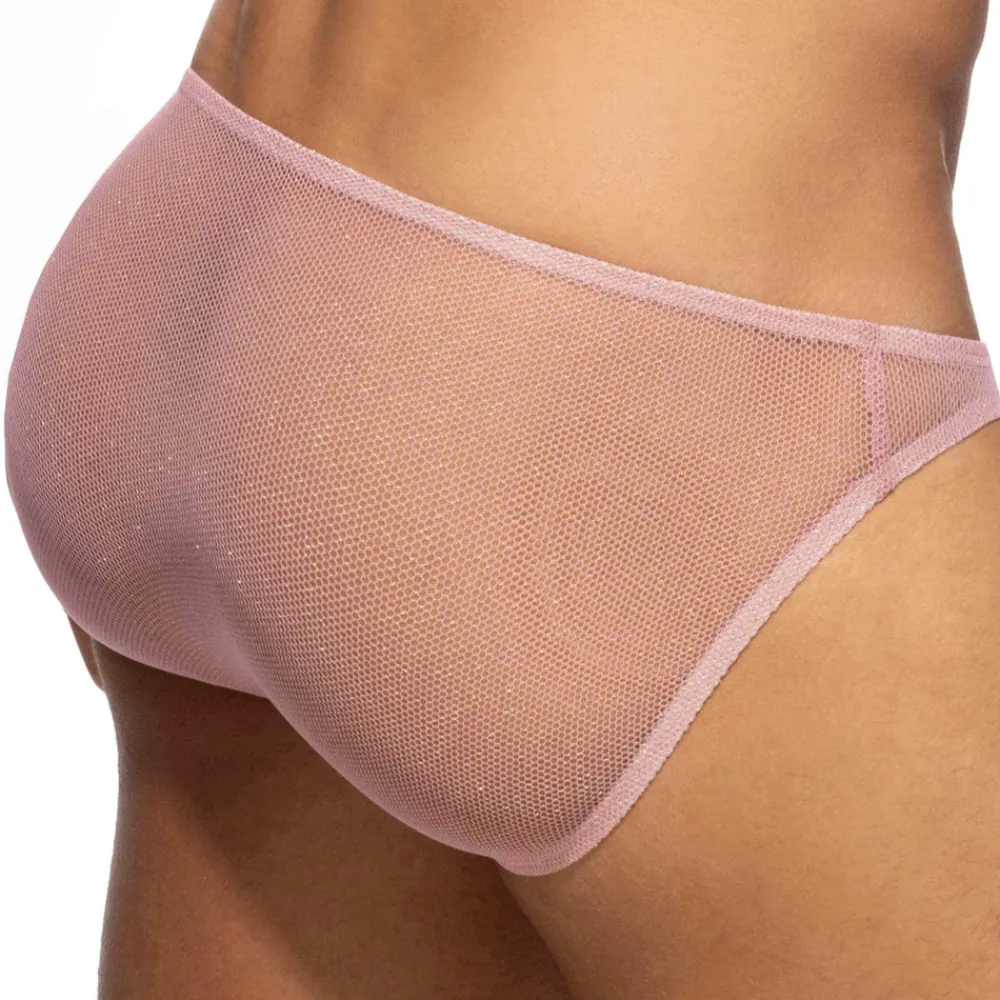 Slip sophistiqué et sexy en résille transparente ornée de fils métallisés dorés. Matière fine, légère et respirante. Coupe taille basse, minimaliste et très ajustée. Poche frontale moulée sans couture pour un confort optimal. Logo Addicted en silicone sur la fine ceinture élastique.