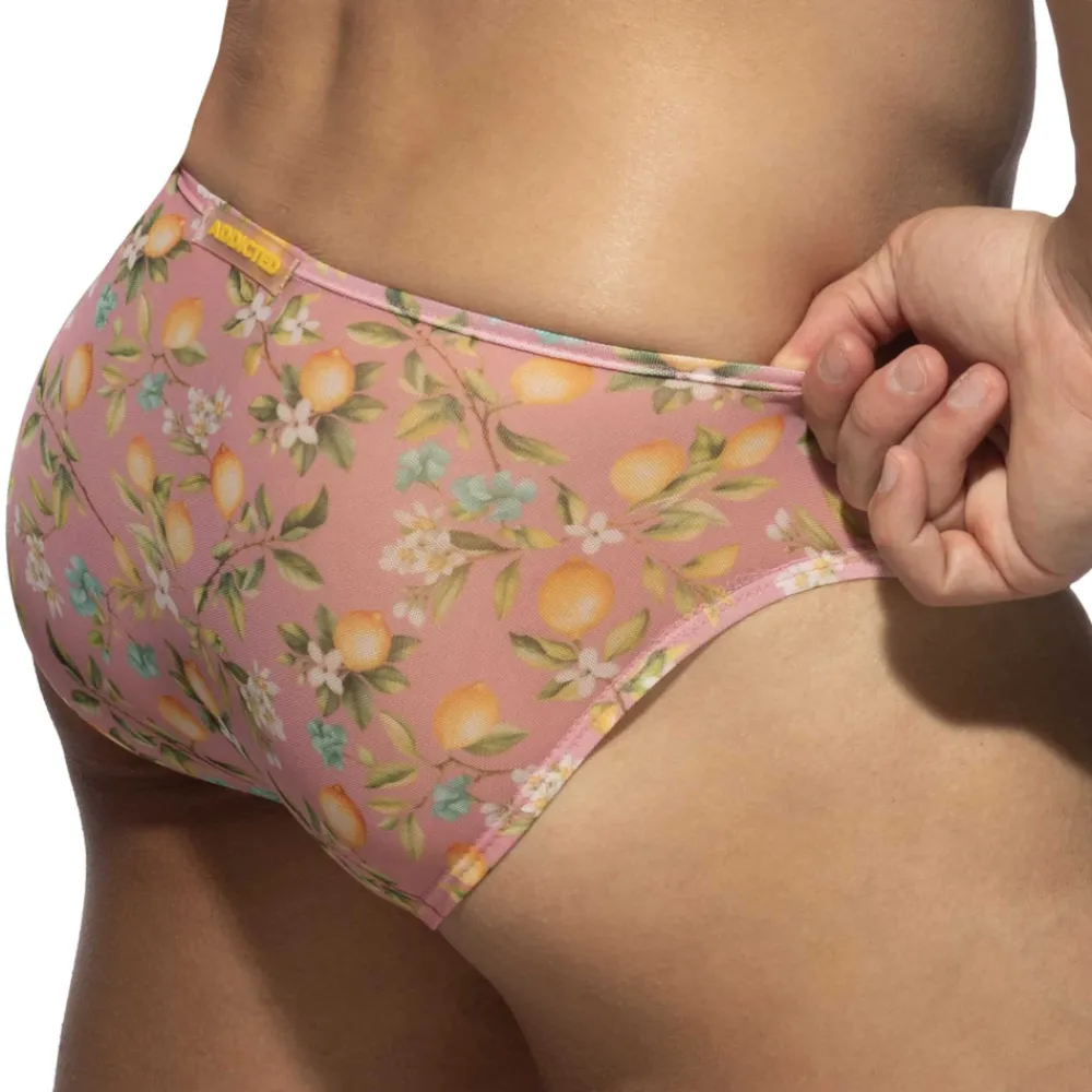 Slip luxueux en résille imprimée d’un motif pétillant fleurs et citrons. Tissu fin, super extensible et totalement transparent. Coupe taille basse, minimaliste et très ajustée. Belle poche frontale non doublée. Etiquette Addicted en silicone à l’arrière.