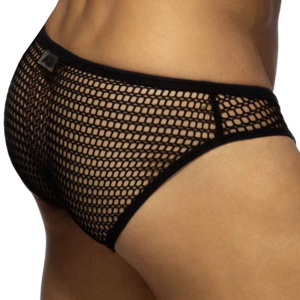 Slip sexy et provocant en résille façon crochet, dont le maillage large laisse peu de place à l’imagination. Non doublé pour une grande transparence. Coupe taille basse, minimaliste et très ajustée. Logo AD en silicone à l’arrière. Edition limitée.