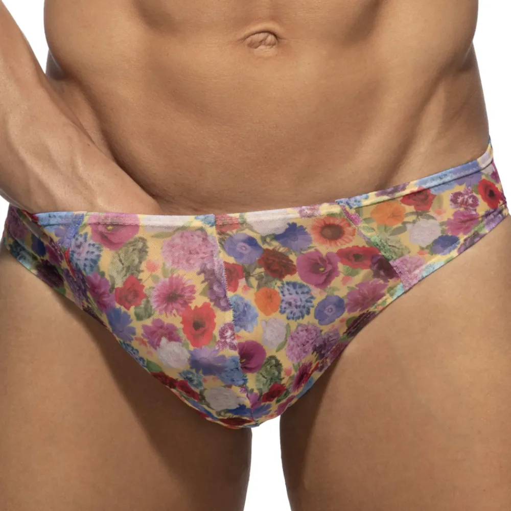 Slip luxueux en résille imprimée d’un motif floral très coloré. Tissu fin, super extensible et totalement transparent. Coupe taille basse, minimaliste et très ajustée. Belle poche frontale non doublée. Etiquette Addicted en silicone à l’arrière.