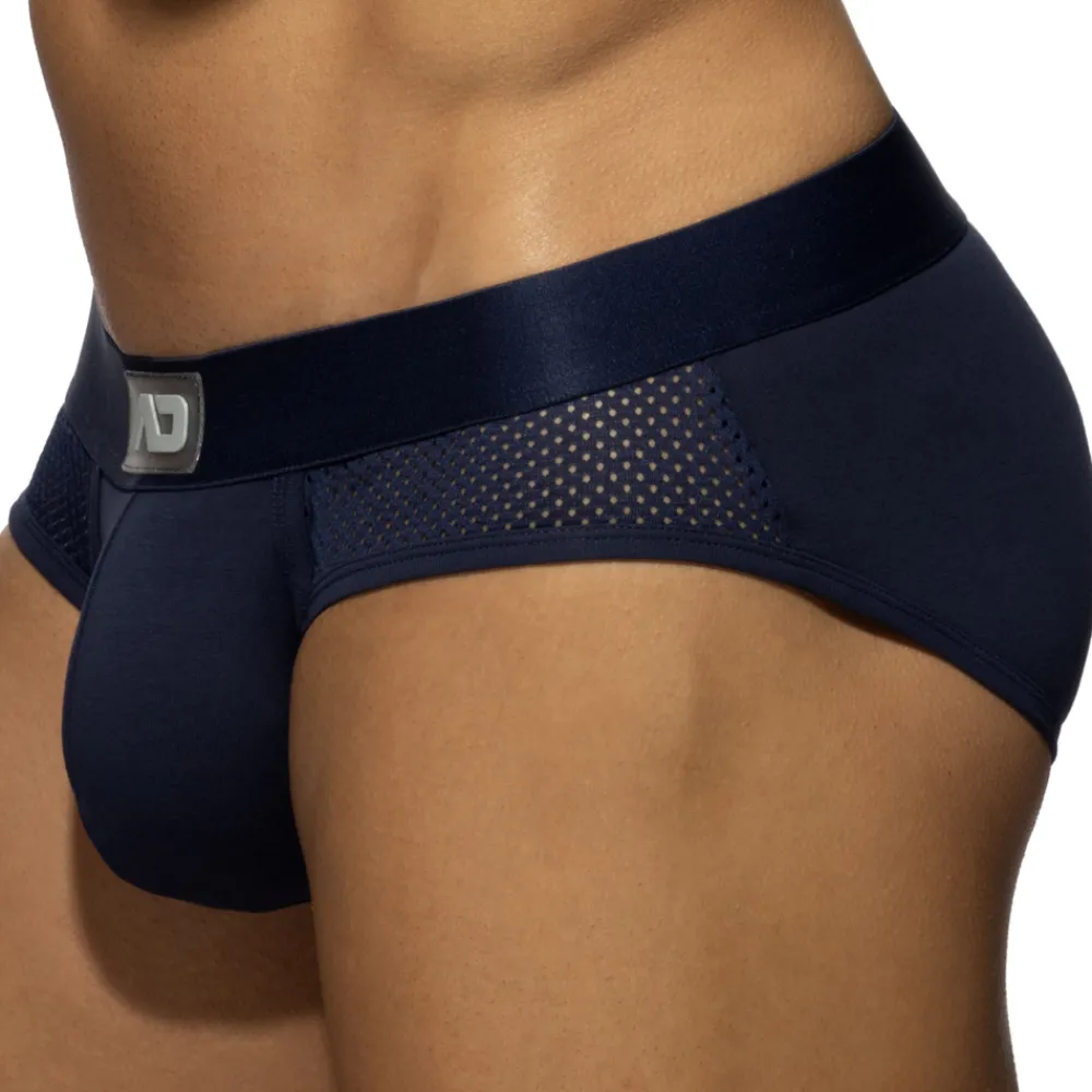 Slip taille basse en coton doux et respirant de couleur unie. Panneaux latéraux en mesh ajouré. Poche frontale de grande capacité. Ceinture élastique avec logo AD en silicone. Edition imitée.