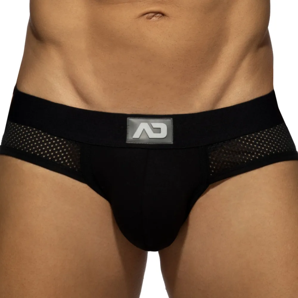 Slip taille basse en coton doux et respirant de couleur unie. Panneaux latéraux en mesh ajouré. Poche frontale de grande capacité. Ceinture élastique avec logo AD en silicone. Edition imitée.