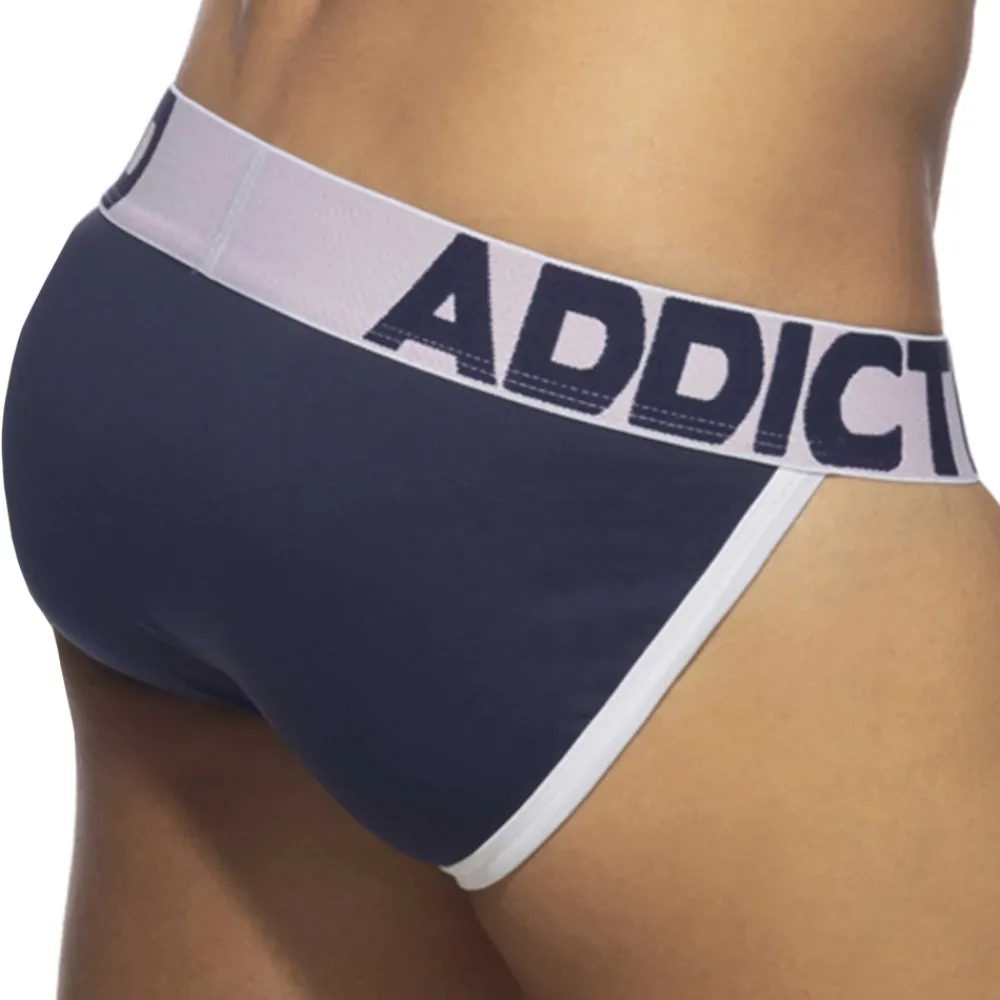 Slip tanga doux et confortable en coton extensible. Poche frontale doublée avec ouverture sur le côté droit pour un accès facile. Détails de couleur contrastée. Large ceinture élastique signée Addicted.