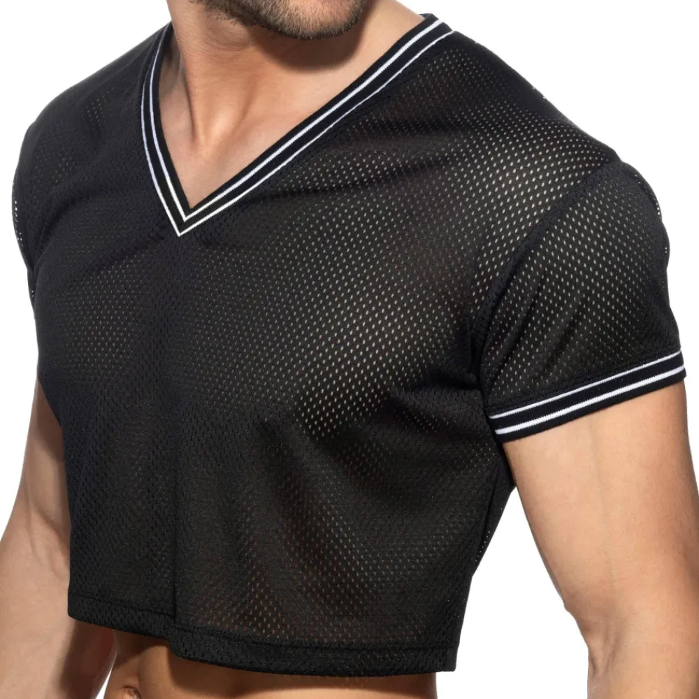 T-shirt en mesh sport, léger et respirant, inspiré du basketball. Coupe raccourcie pour dévoiler vos abdos. Manches courtes et col en V soulignés par une double bande sport. Etiquette AD en silicone dans le dos.