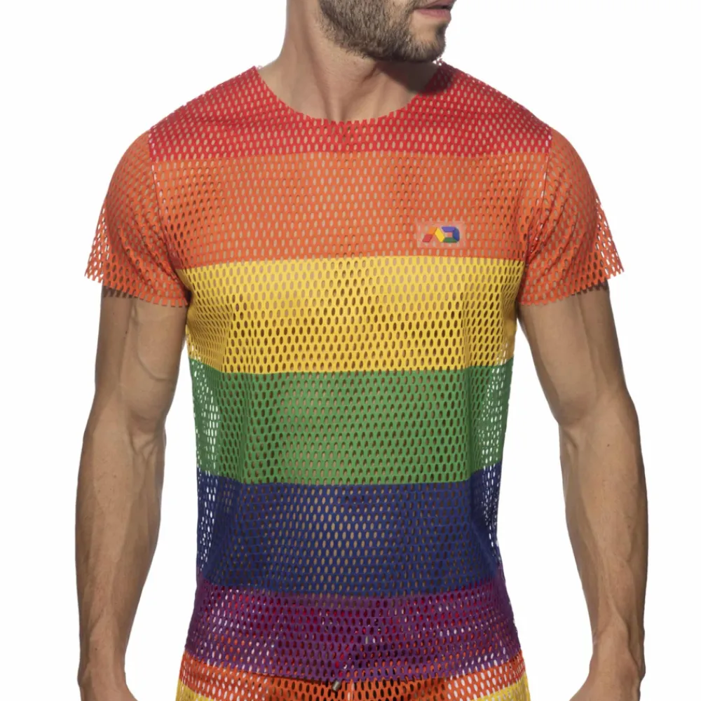 T-shirt très sexy en mesh sport, dont le maillage large laisse peu de place à l’imagination. Imprimé rayé aux couleurs de l’arc-en-ciel. Coupe oversize. Logo AD en silicone sur la poitrine gauche.