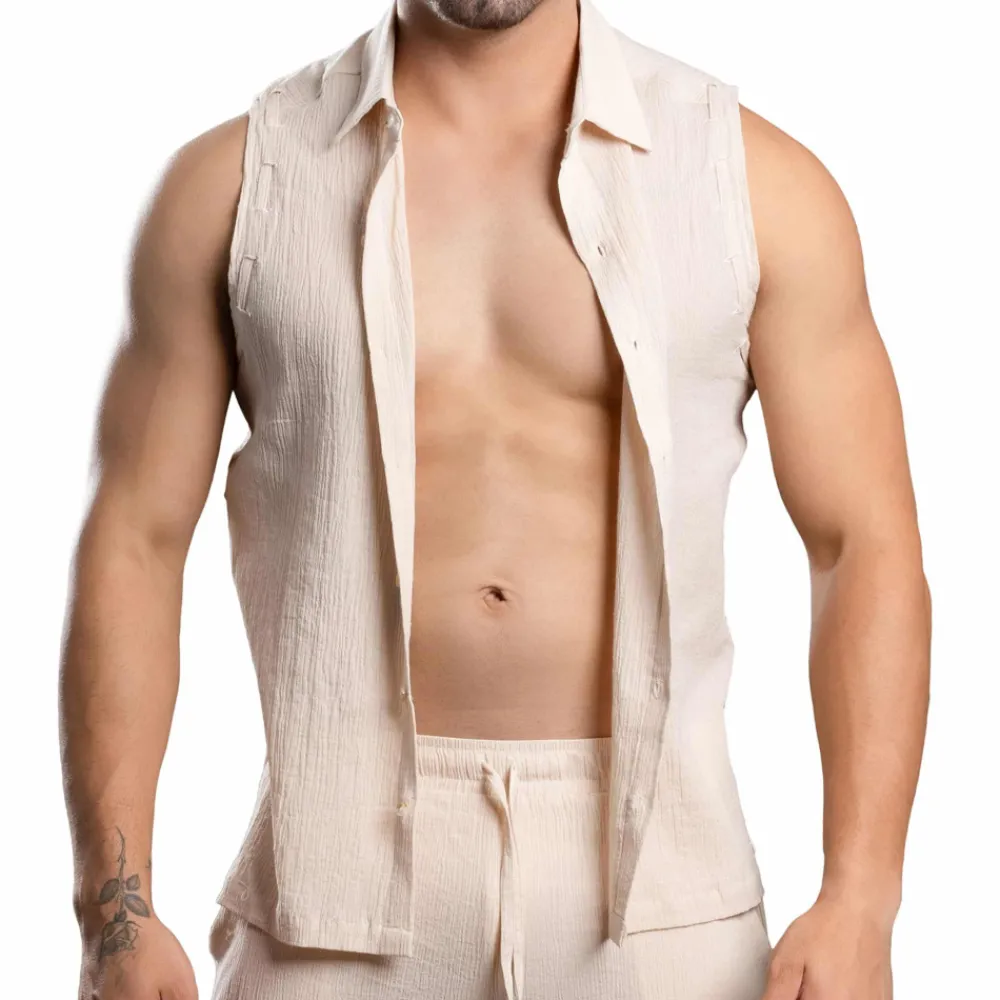 Chemise légère sans manches en crêpe de coton doux et respirant. Coupe originale avec ses ouvertures latérales fermées par 3 boutons. Fermeture devant par 7 boutons. Cordons ajustables au niveau des emmanchures. Logo Andrew Christian sur la hanche gauche. Édition limitée.