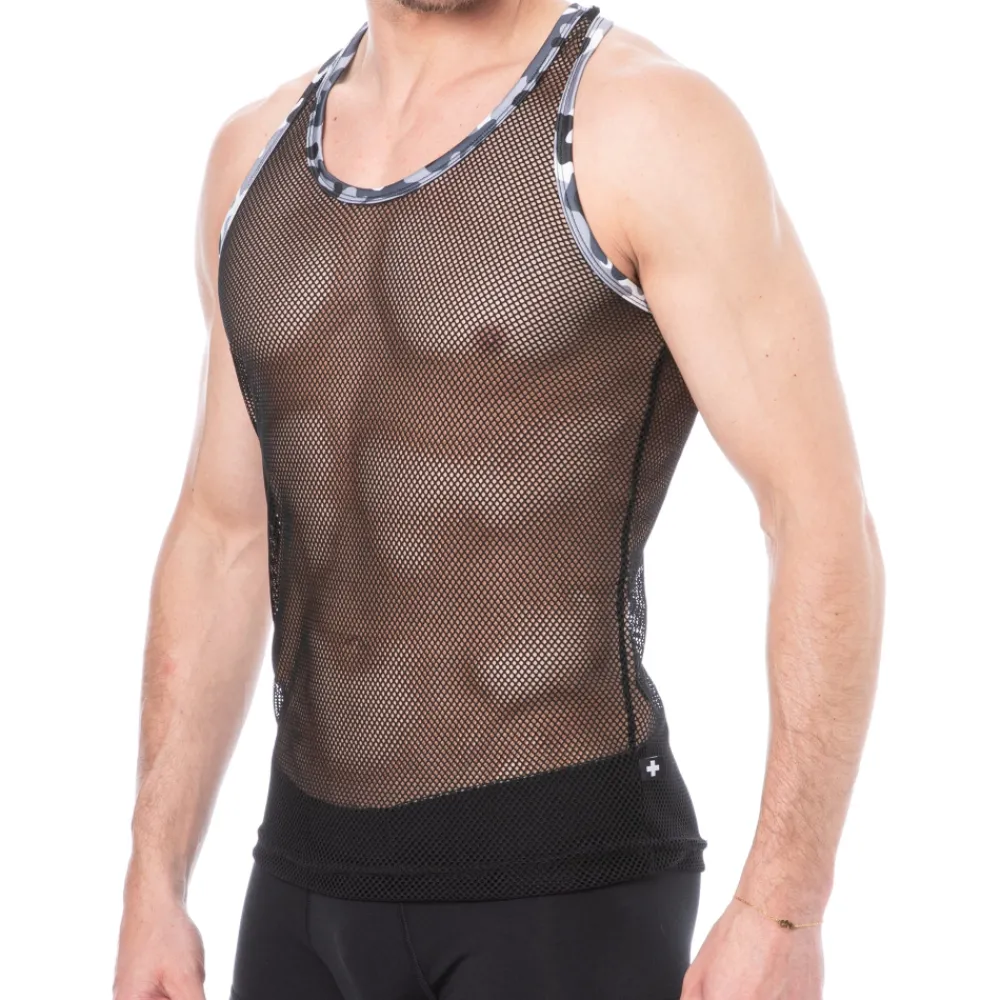Débardeur en maille ajourée et transparente. Tissu très doux, extensible dans 4 directions. Détails de couleur camouflage. Edition limitée