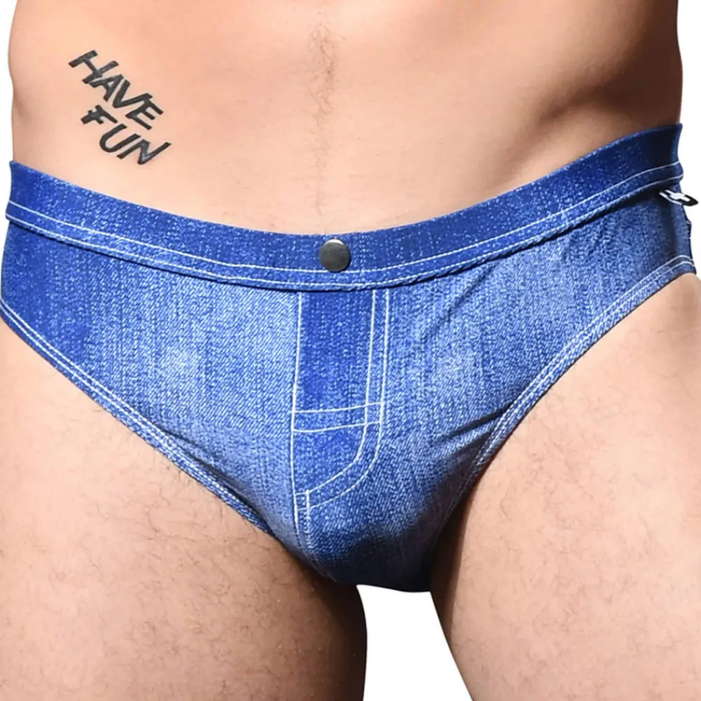 Slip de bain sexy en microfibre extensible douce et confortable. Design imitant le jeans avec braguette factice, surpiqûres contratées et bouton métallique. Coupe bikini taille basse et ajustée. Poche frontale souple soutenant les organes génitaux sans les comprimer. Fine ceinture élastique recouverte. Edition limitée.