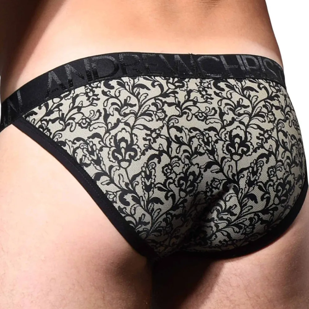 Slip taille basse en microfibre extensible, douce et confortable. Imprimé imitant de la dentelle florale noire sur un fond beige. Poche frontale Almost Naked, qui épouse et soutient les organes génitaux, sans les comprimer. Ceinture élastique amincissante signée Andrew Christian. Edition limitée.
