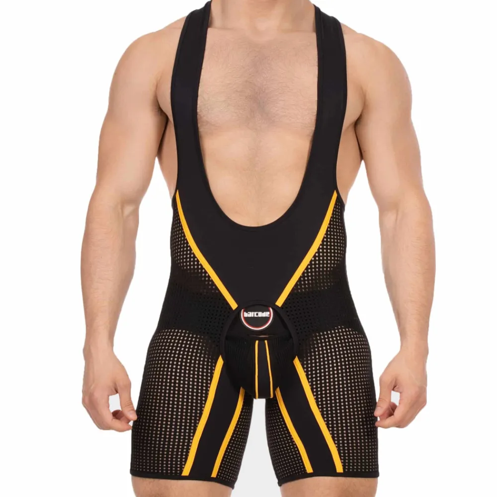 Body sexy et provocant combinant microfibre extensible et résille sport. Totalement ouvert devant et derrière pour un accès facile aux parties intimes (sous-vêtement en photo vendu séparément). Col en U plongeant révélant le torse. Détails de couleur contrastée. Logo Barcode en silicone dans le dos.