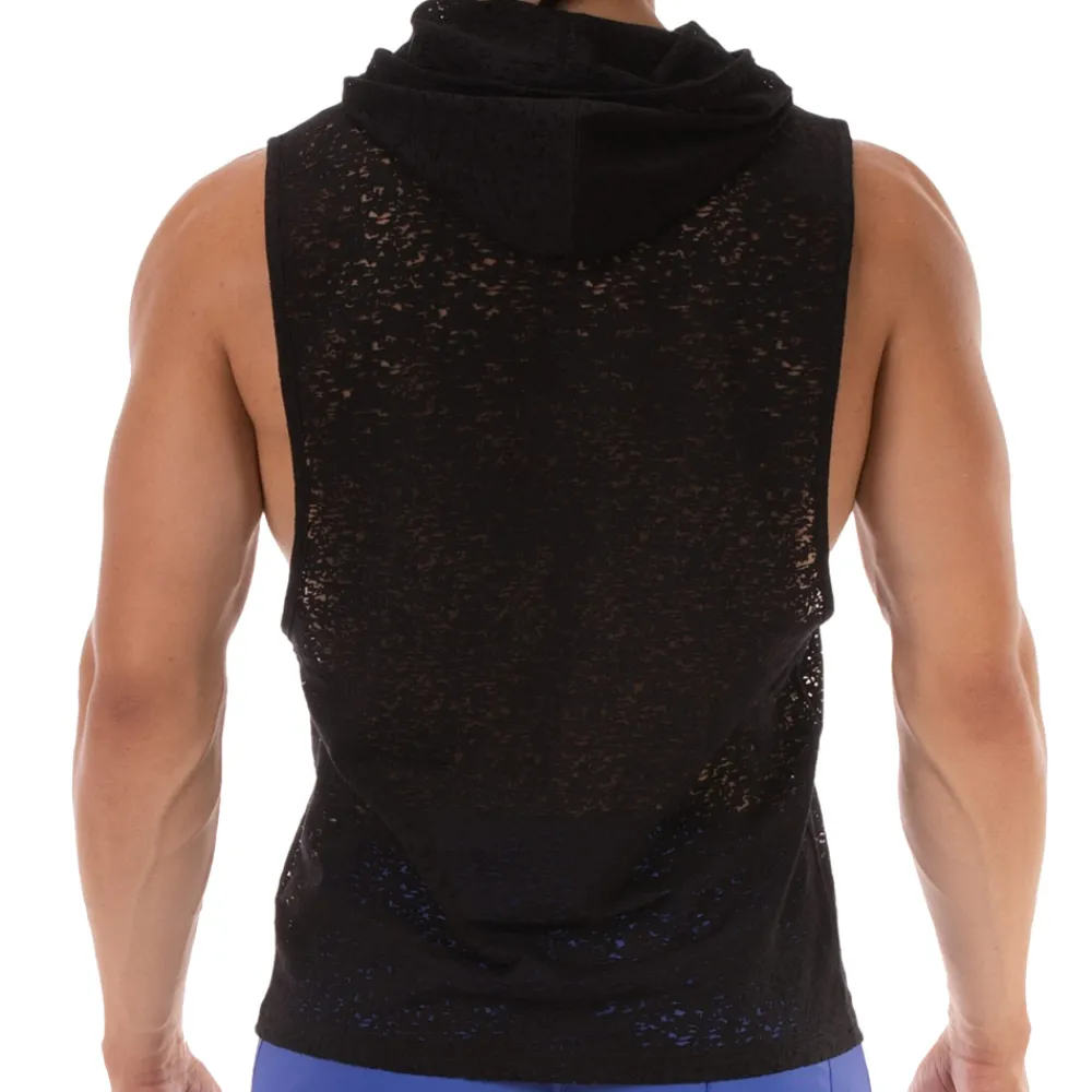 Débardeur à capuche en tissu dévoré semi-transparent. Larges ouvertures sous les bras. Logo Barcode en silicone sur la poitrine.