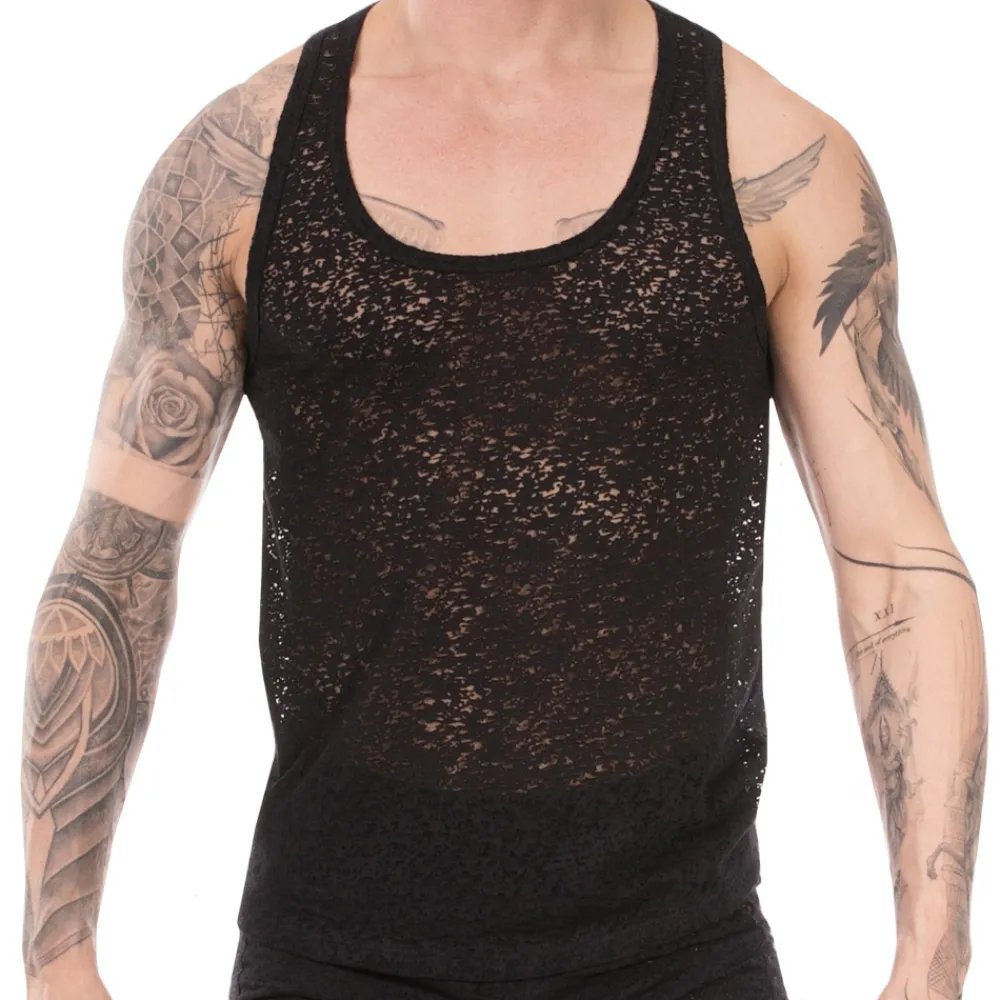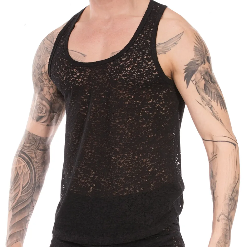 Débardeur en tissu dévoré semi-transparent. Coupe ajustée avec col rond et dos nageur. Etiquette Barcode en silicone en haut du dos.