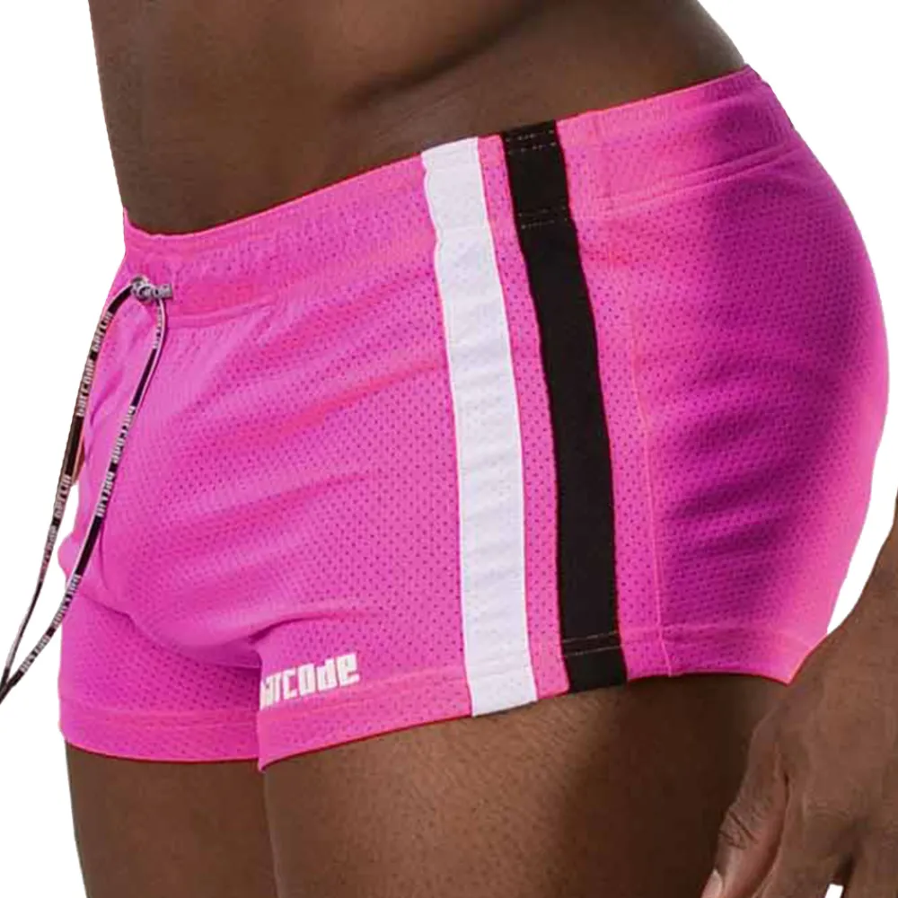 Short court et sexy en mesh respirant non doublé. Bandes sport colorées sur les côtés. Poche intérieure pour un grand confort frontal. Ceinture élastique avec cordon de serrage. Logo Barcode sur la cuisse gauche.