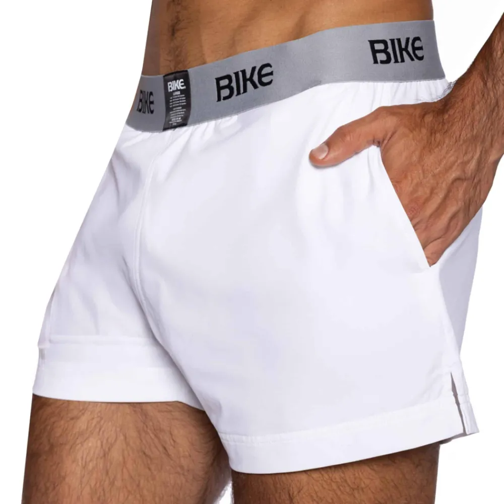 Short sport intégrant un jockstrap pour un confort et un maintien incomparables. En microfibre extensible, douce et légère. 2 poches. Large ceinture élastique de couleur contrastée signée BIKE.