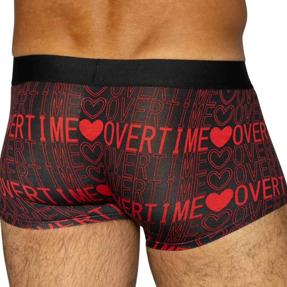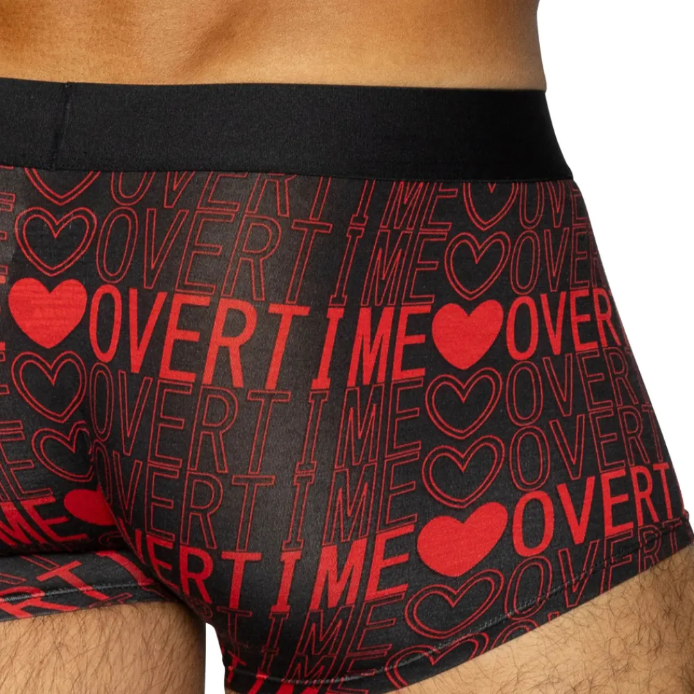 Boxer sport et sexy en modal extensible super doux et confortable. Motif cœurs avec inscription « Overtime ». Coupe taille basse très ajustée. Poche frontale doublée. Ceinture élastique signée BIKE en lettres dorées.