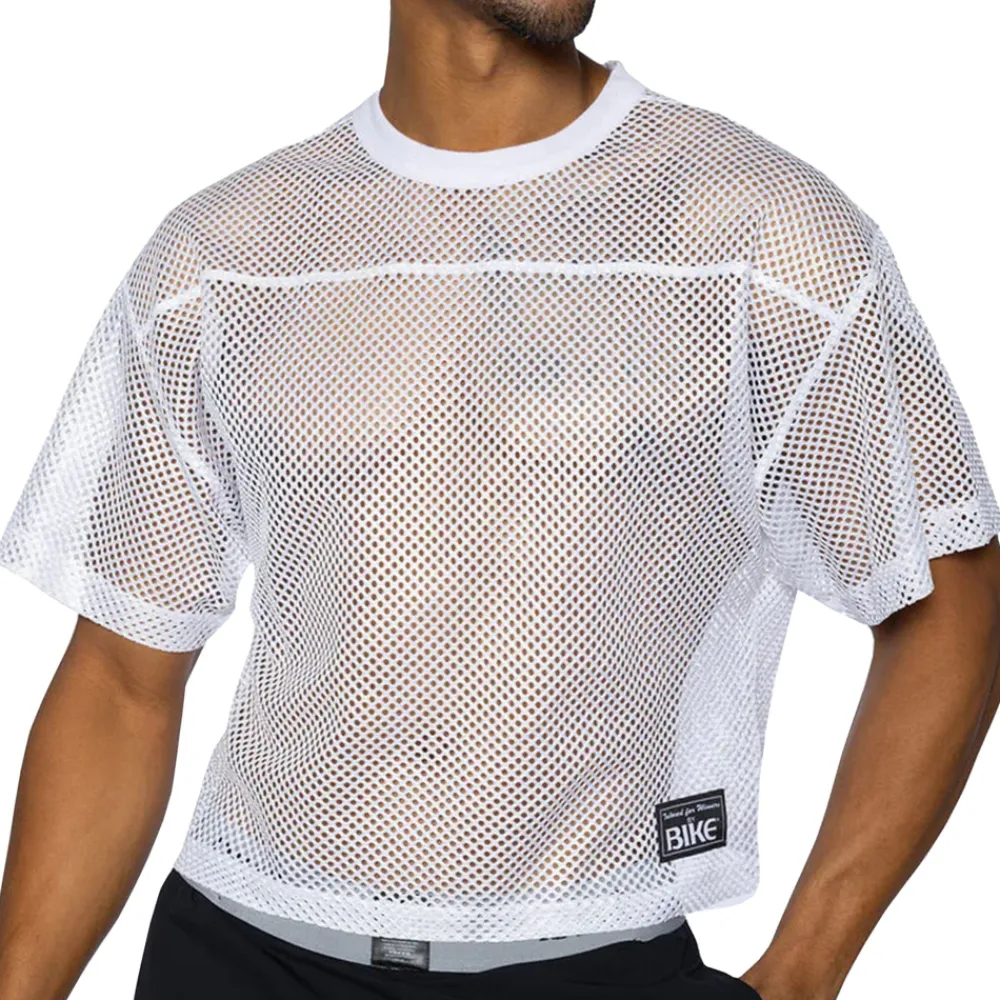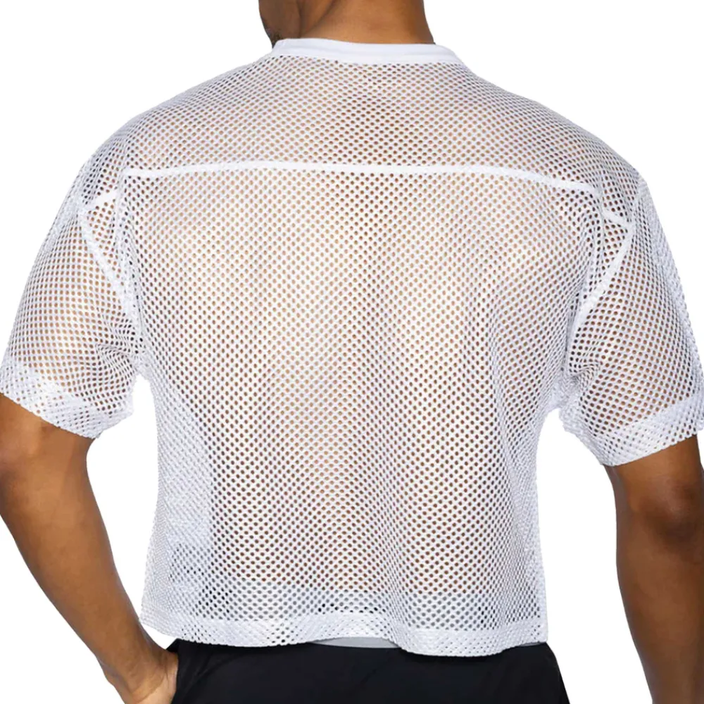 T-shirt court en résille extensible, transparente et ultra légère. Coupe vintage, à la fois courte et oversize, qui s’insipire des maillots d’entrainement du football américain.